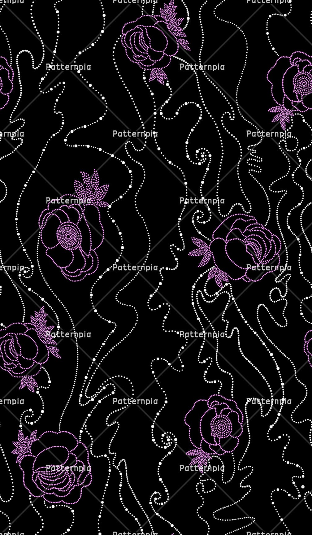 Ethereal dotted roses and flowing stardust trails on a solid black ground.
