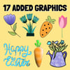 5 - 17 "Easter more" other PNG files with transparent background of tulips, carrots, happy Easter text and more.