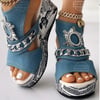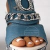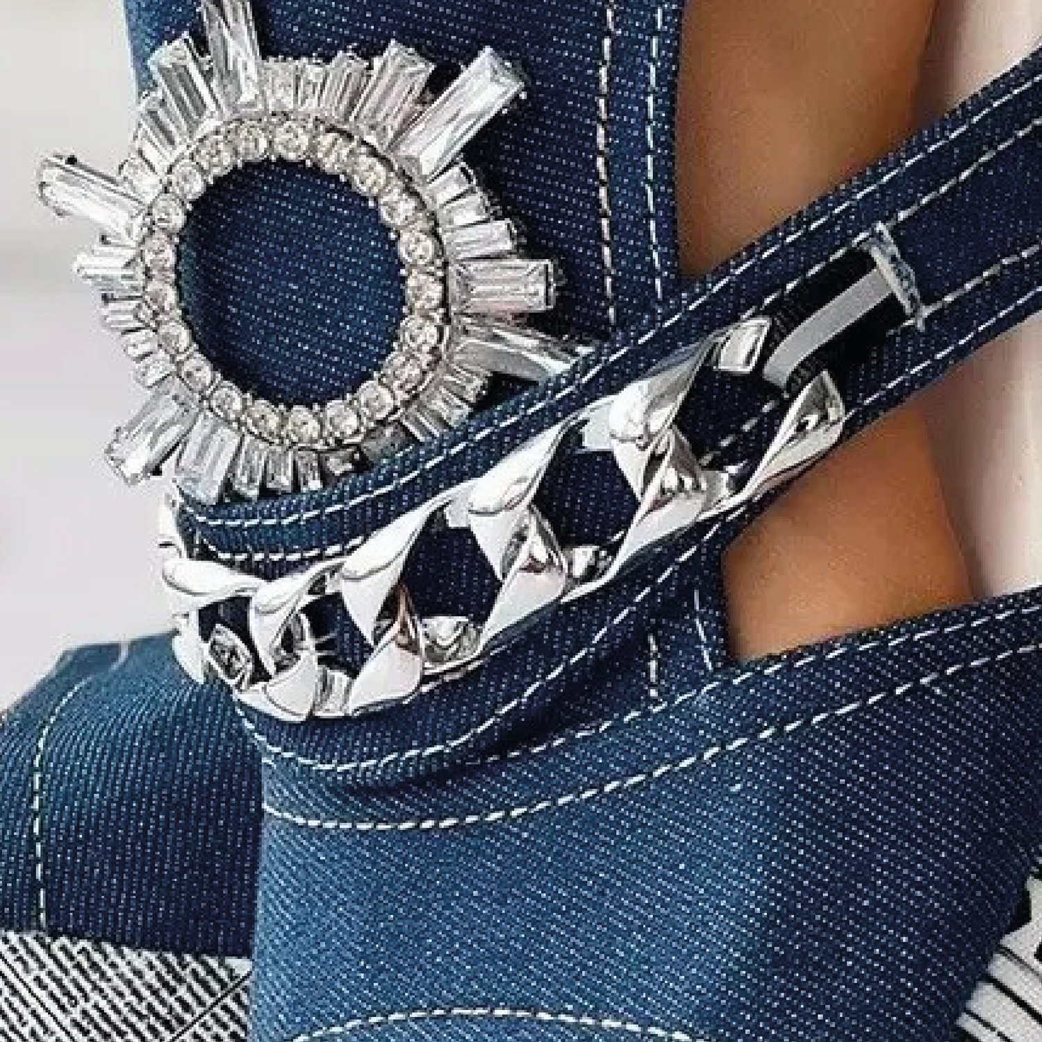 Mettez en valeur votre style avec ces sandales compensées femme au design unique et tendance ! Conçues en denim bleu avec une plateforme imprimée “journal”, elles allient confort, originalité et élégance. Leur décoration strass façon gear pattern et leur chaîne argentée apportent une touche glamour parfaite pour sublimer toutes vos tenues estivales.