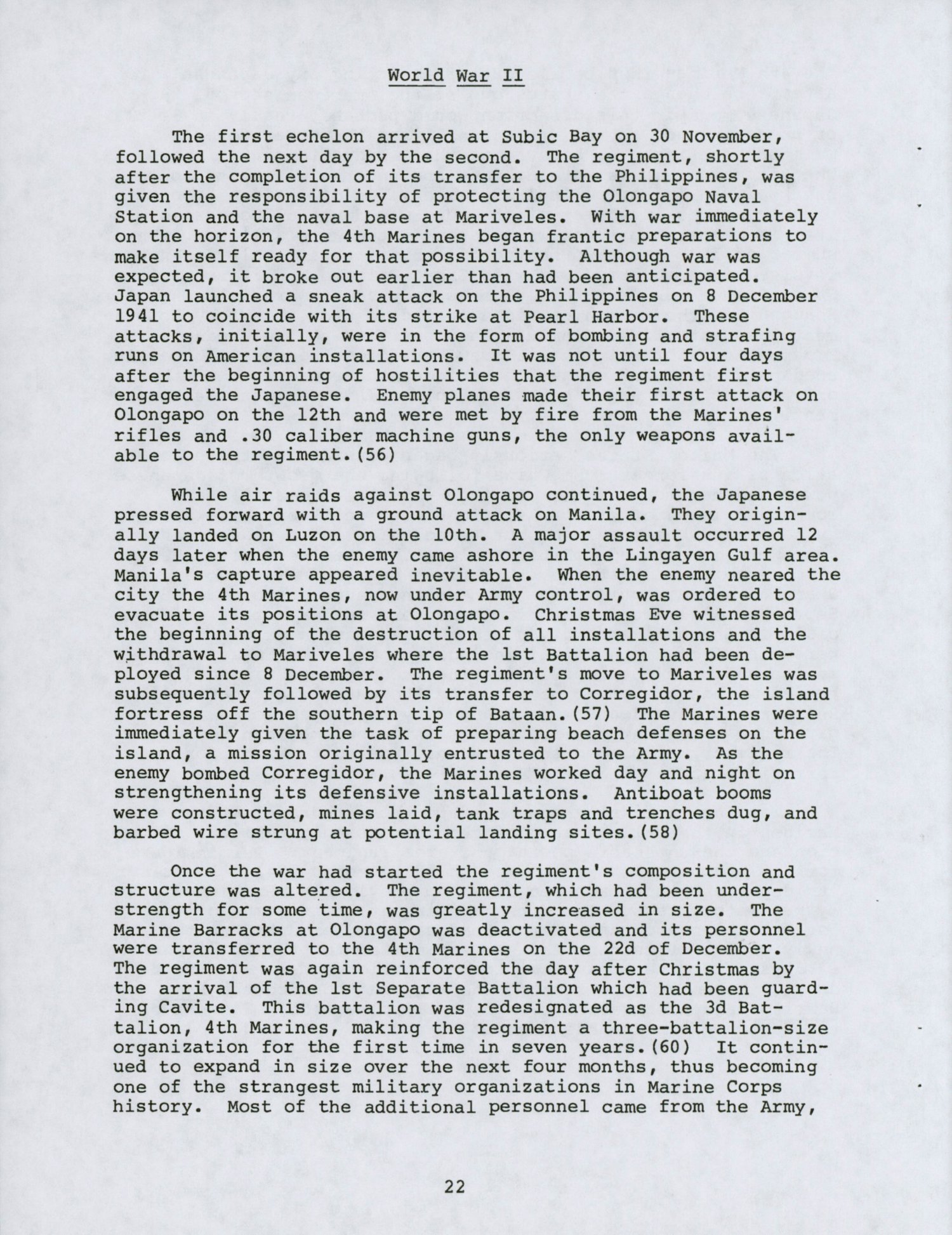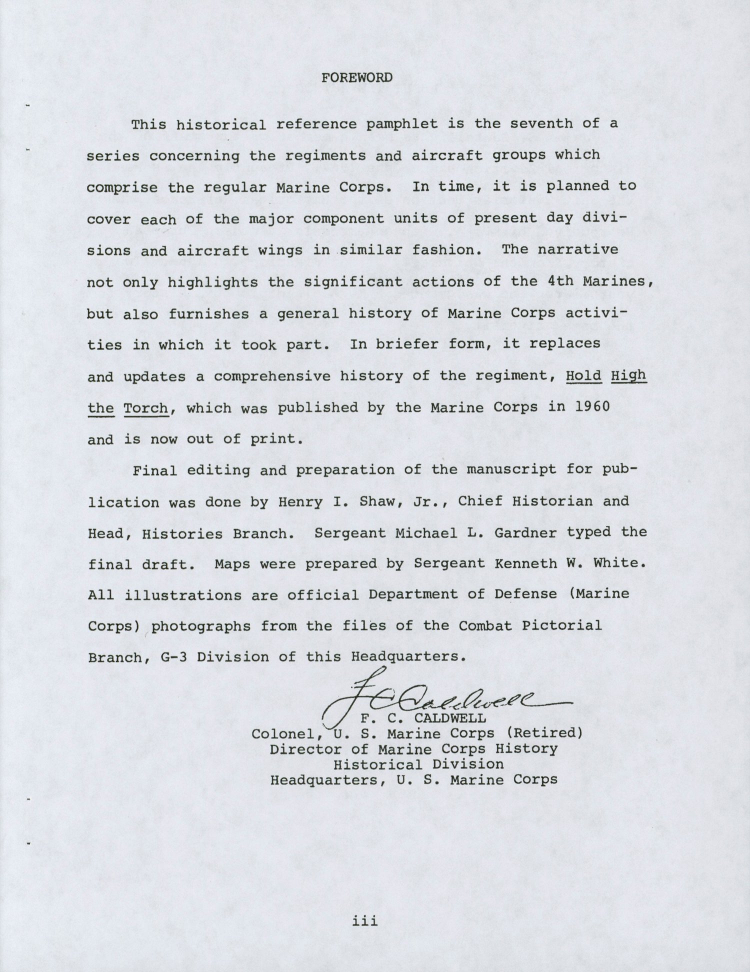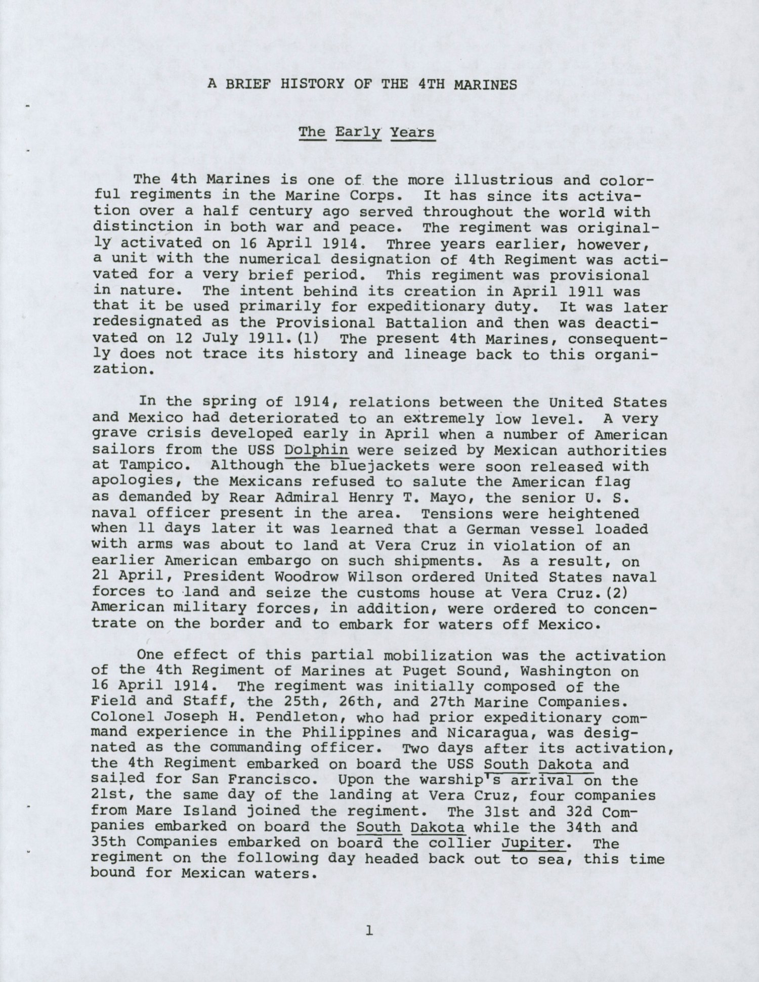 "A Brief History of the 4th Marines" is a concise narrative of the regiment since its initial activation over a half century ago. Official records of the Marine Corps and appropriate historical works were utilized in compiling this chronicle. It is published for the information of those interested in the 4th Marines and in the events in which it has participated.