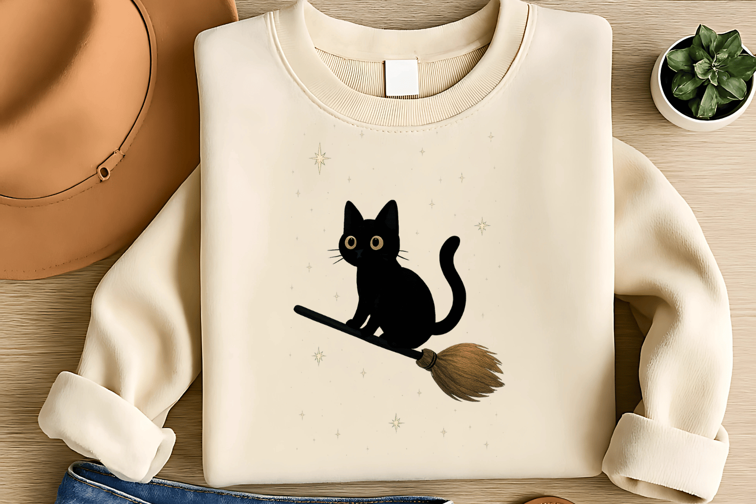 Broom Ride Black Cat Sublimation PNG – Flying Clipart for T-Shirts – Whimsical Halloween Theme – 300 DPI Instant Digital Download