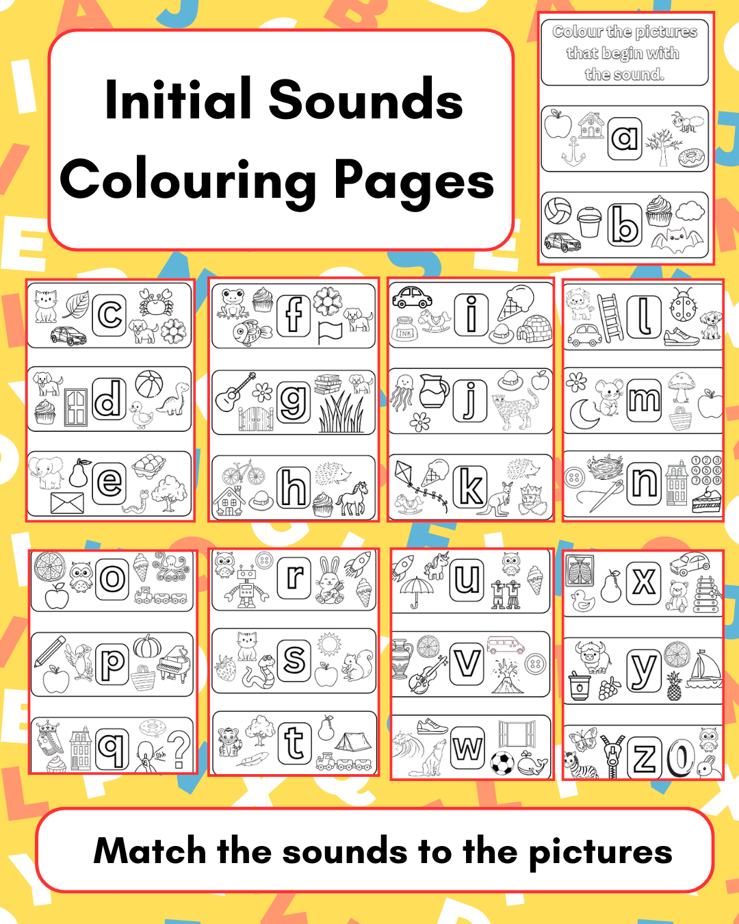 A phonics resource for Early Years or to support learning in KS1. Includes 9 sheets with phase 1 alphabet sounds and pictures to colour that begin with the sound.