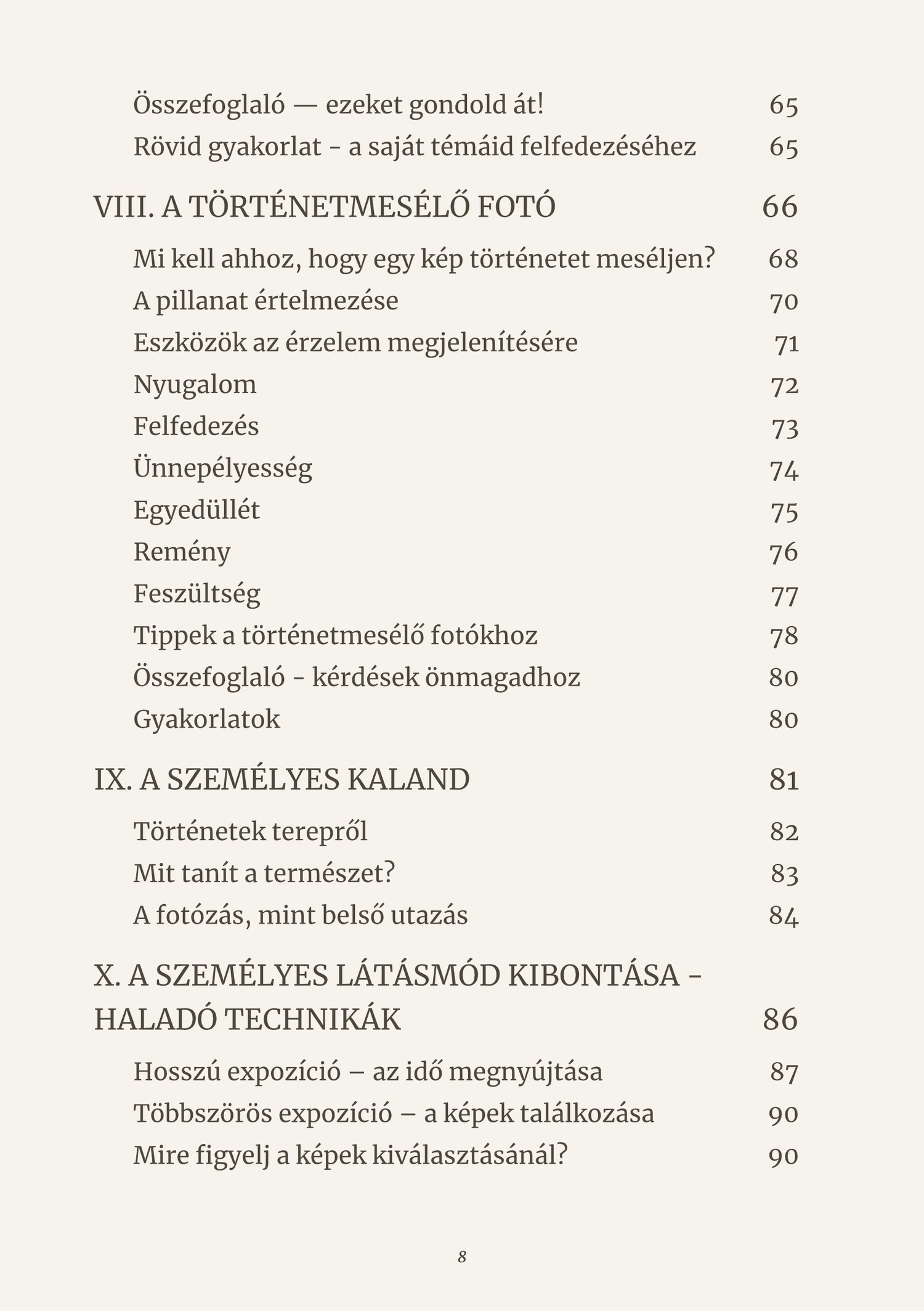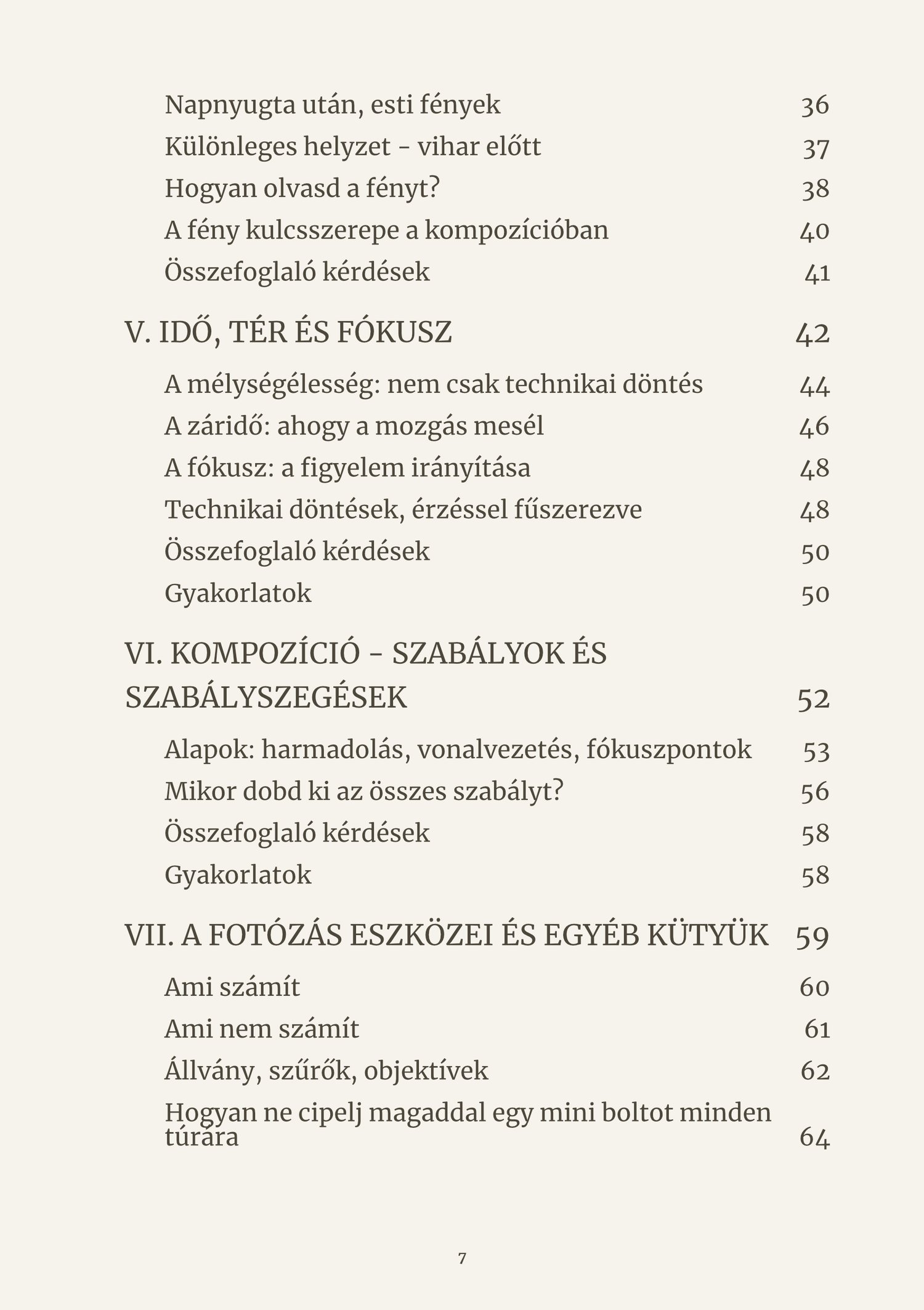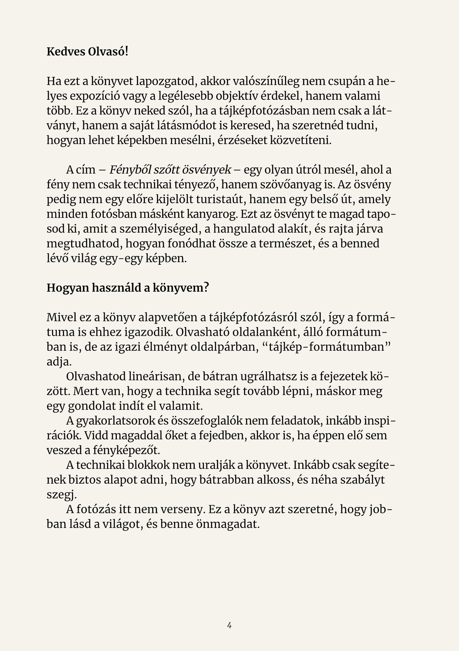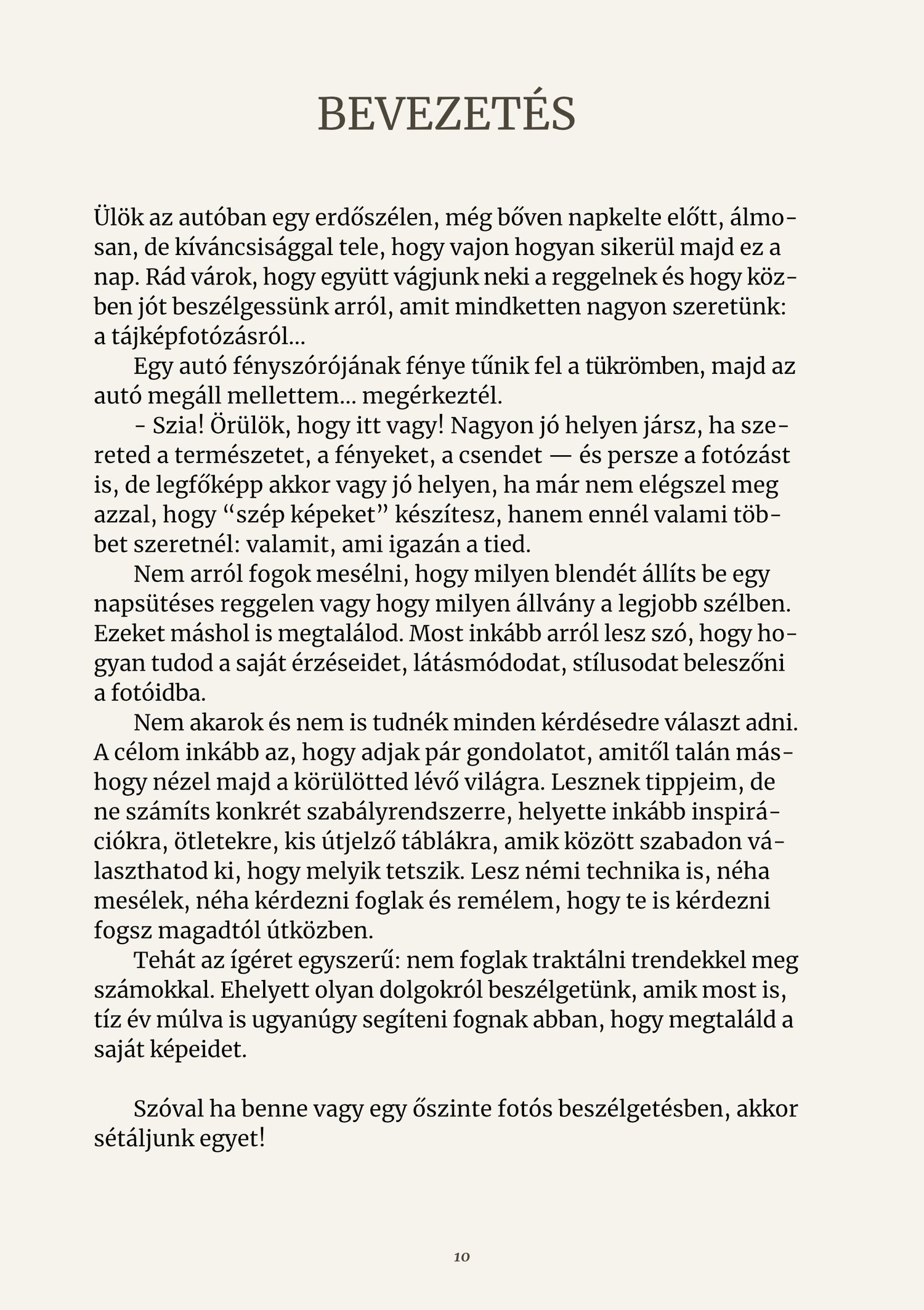 Ebben a könyvben nem az lesz a lényeg, hogy hány megapixel a géped, mennyire karcol az objektíved vagy mennyi szűrőt cipelsz magaddal. Hanem az, hogy mit látsz meg a világban és mit akarsz megmutatni belőle, és hogyan lehet a fotózás egy személyes kaland, hogyan válhat egy egyszerű tájkép valami sokkal mélyebbé.