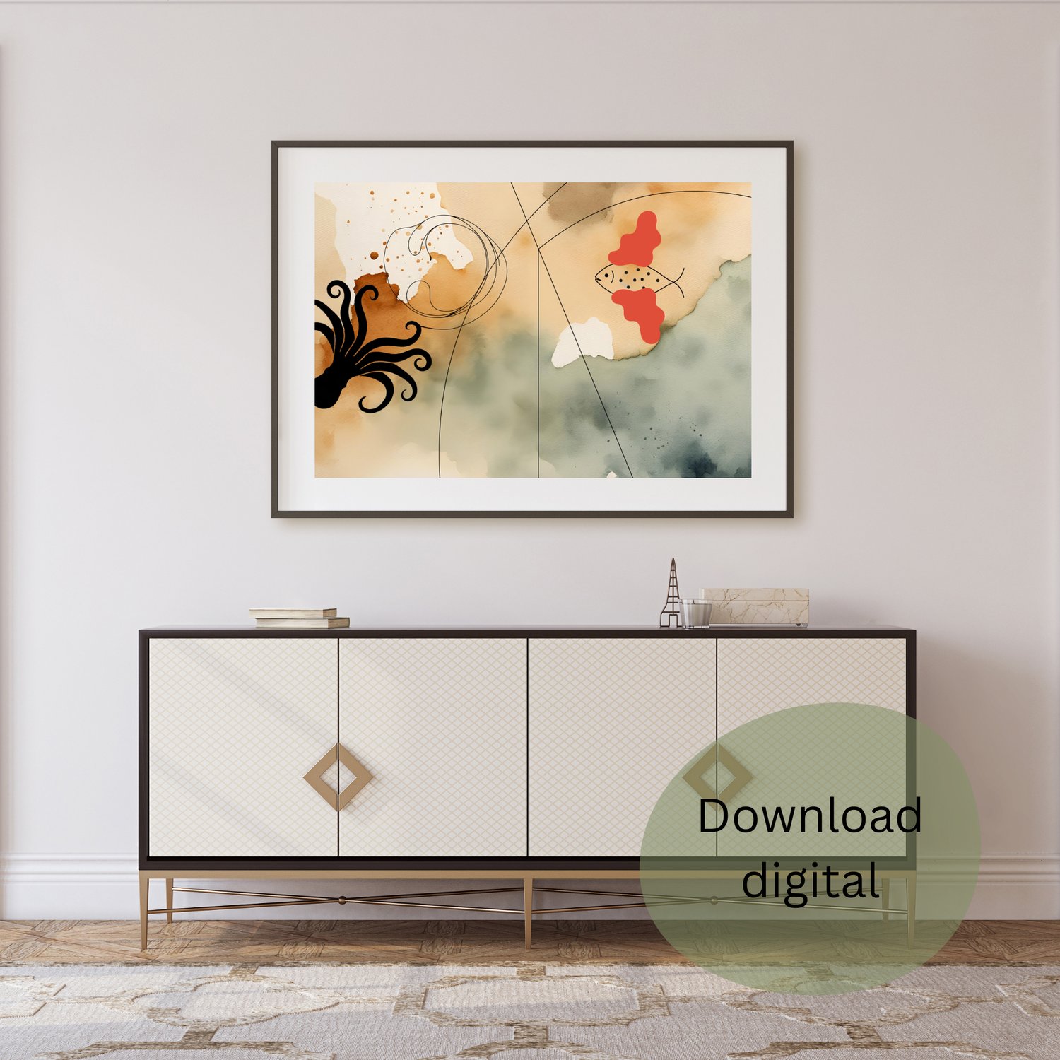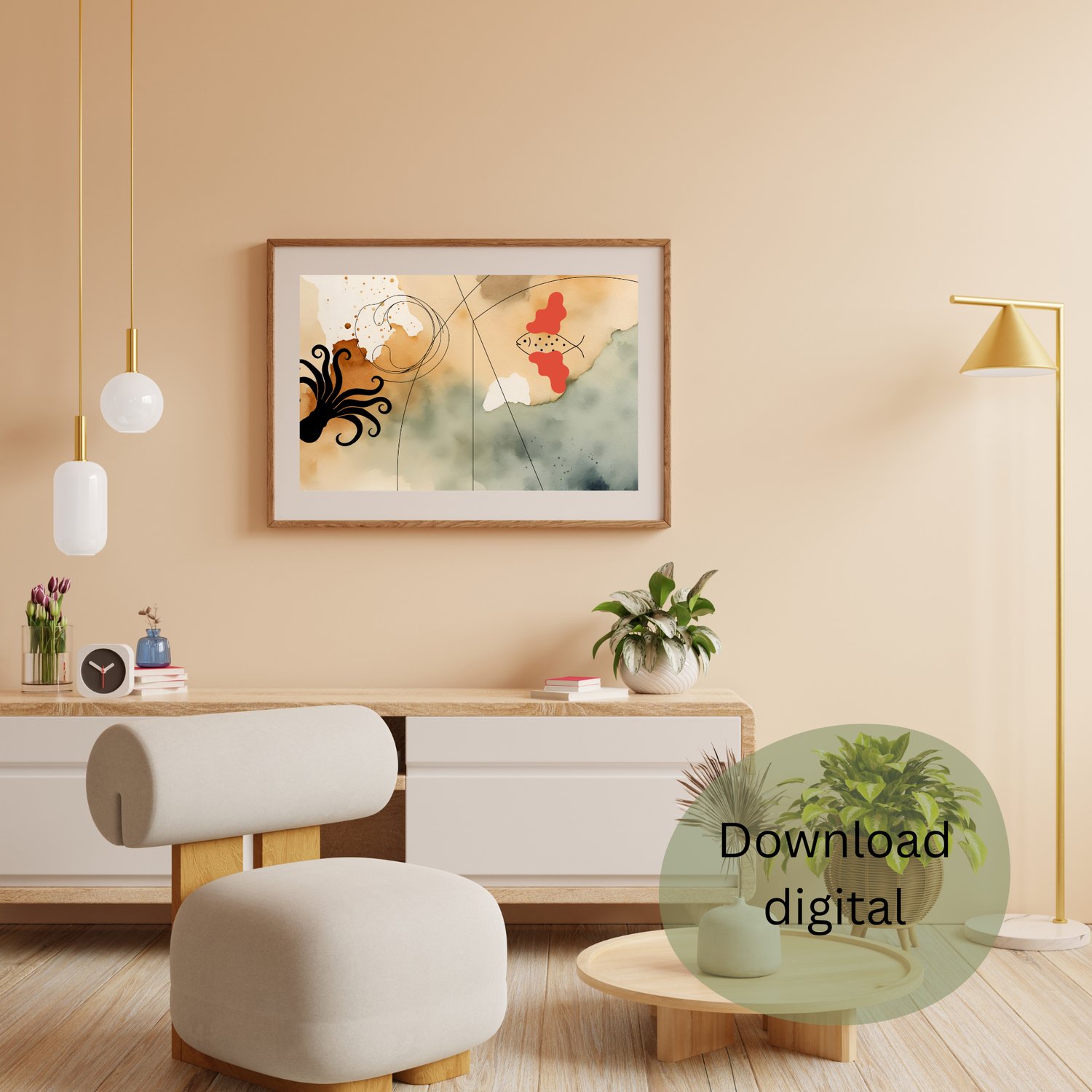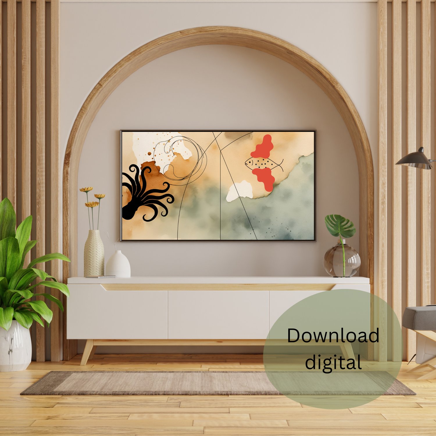 Dê um toque moderno e sofisticado ao seu espaço com esta arte digital exclusiva! 🌿✨ Perfeita para qualquer ambiente, esta peça combina tons neutros e um design abstrato harmonioso.