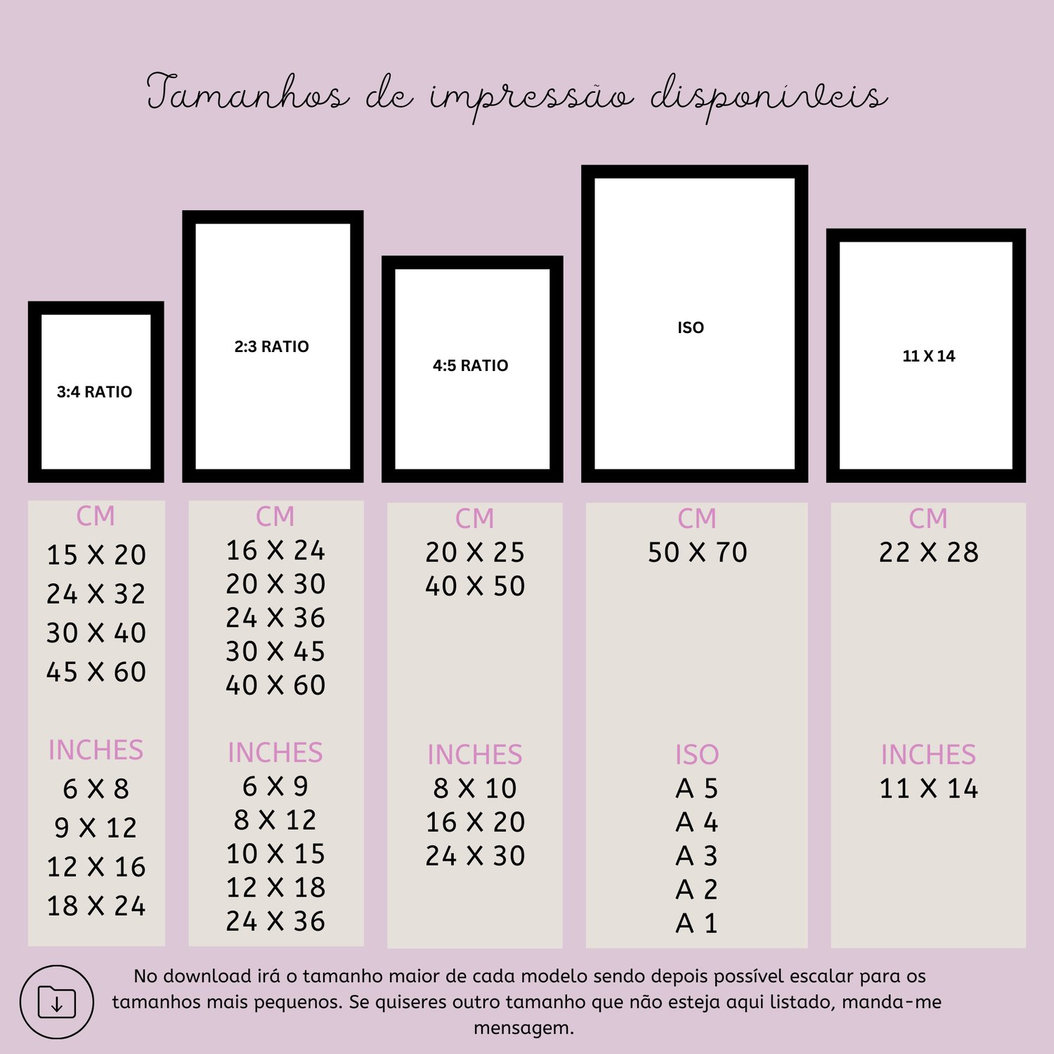 Disponibilizamos os ficheiros nas principais proporções para que possas imprimir no tamanho que preferires. Podes ver todas as opções na imagem de referência. Caso precises de um tamanho diferente, basta enviares mensagem!