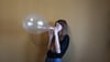 Svenja blowing this clear metallic balloon to its limits