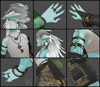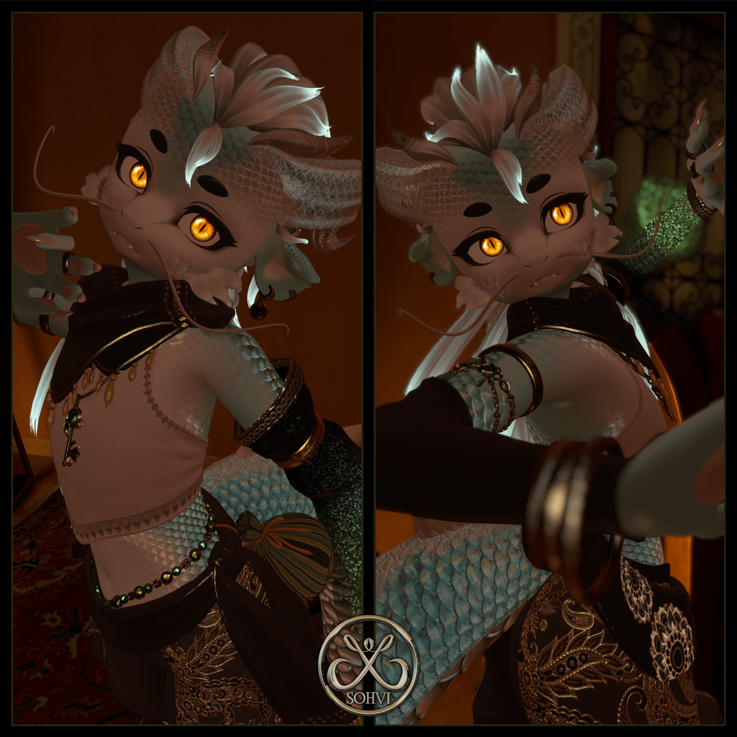 All clothes and accessories, Hair, Dragon parts, Body and eye textures, Custom coin texture, All Particles, AFK pose, Menu icons by me (sohvi.art) in Blender, Substance Painter and Clip studio paint. All images used are clip studio brushes or hand painted.