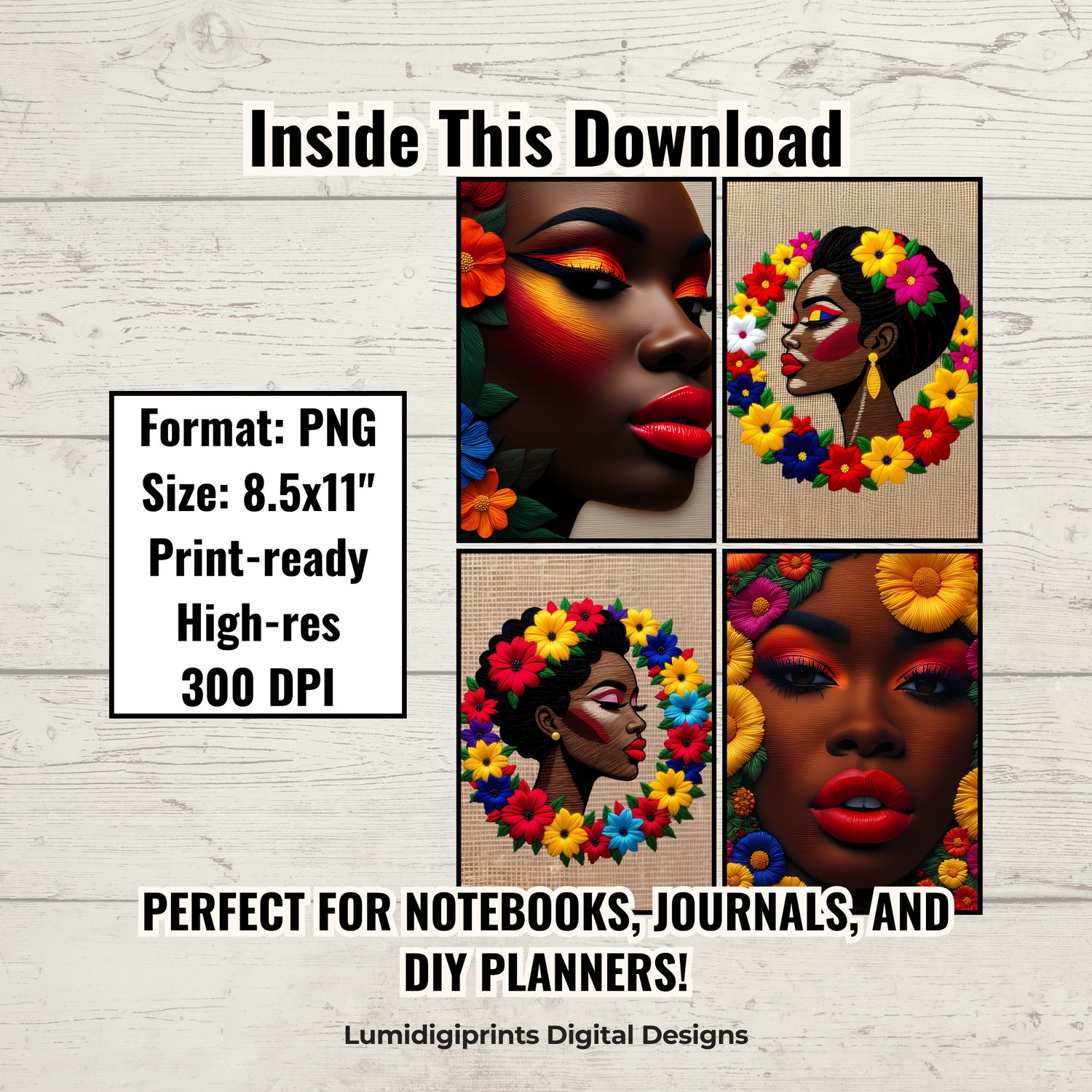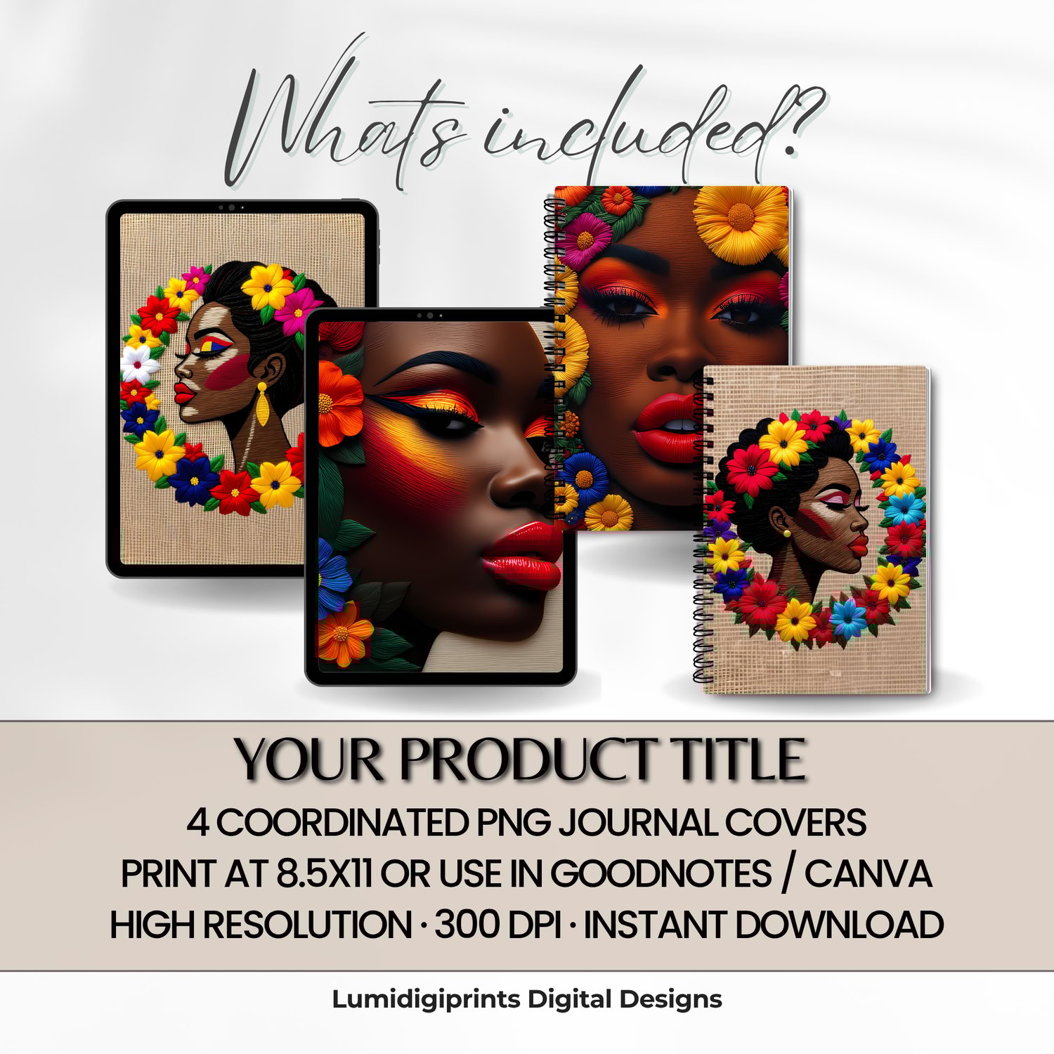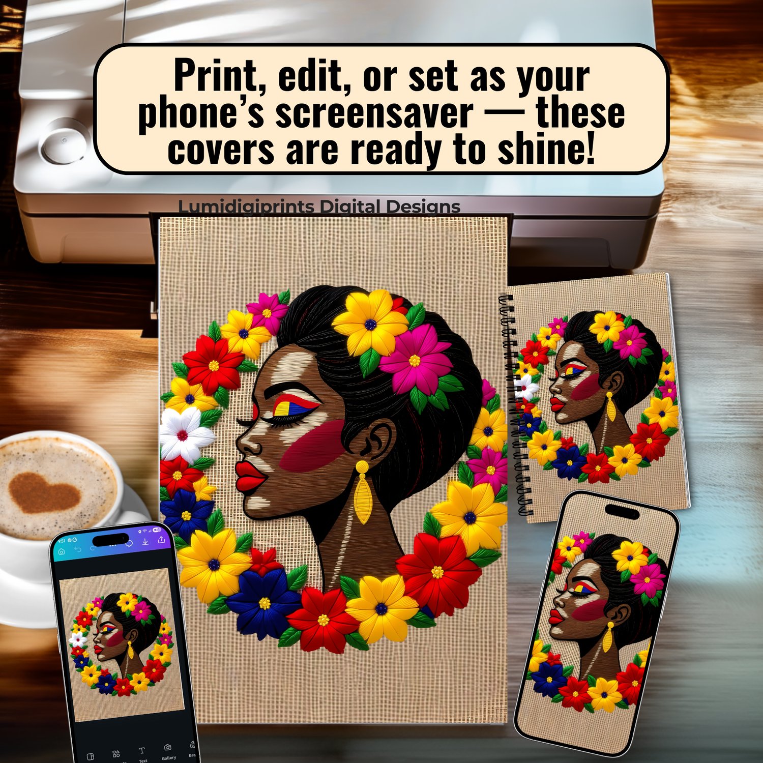 Digital Journal Covers, Editable & Printable | Embroidered Beauty PNG Set for Goodnotes & Canva