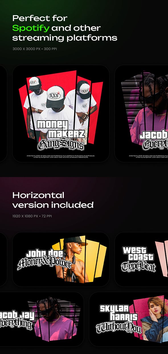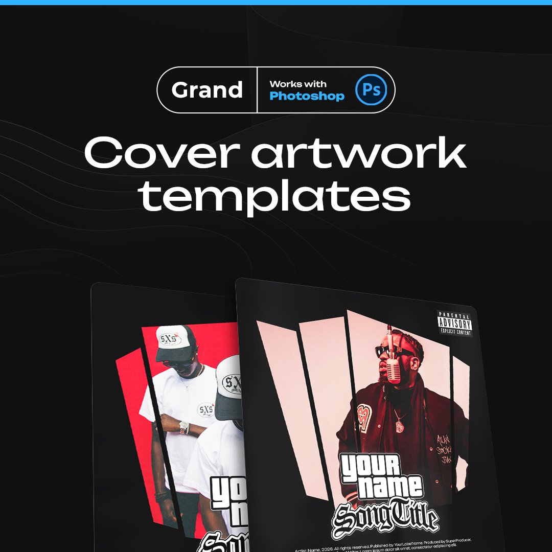 Introducing Grand — a set of cover art templates for Photoshop, inspired by the legendary Grand Theft Auto game series. Designed for artists, music producers, and DJs, these templates are perfect for creating cover art for beats, singles, albums, or playlists. The horizontal version can also be used as a YouTube thumbnail.