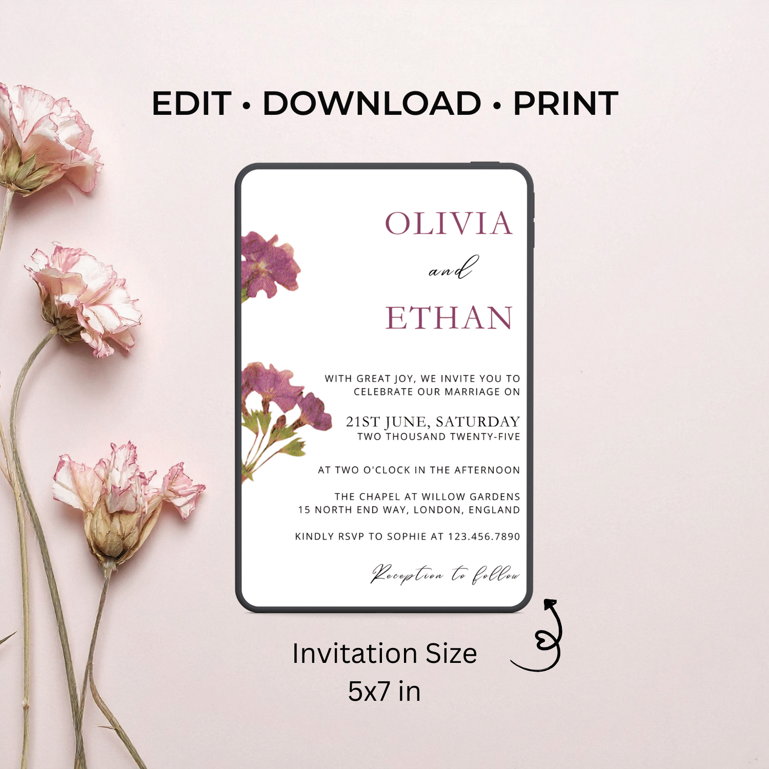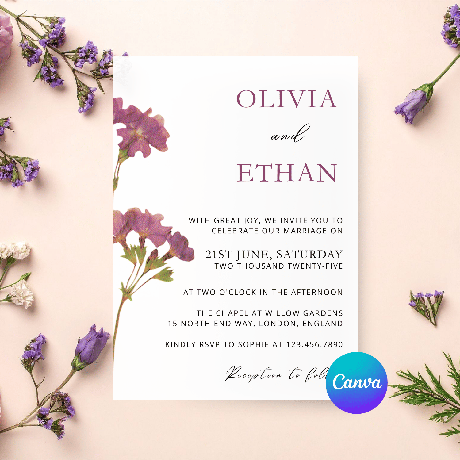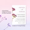 W003 Editable Purple Petunia Floral Wedding Invitation Template | Purple Canva Wedding Invite | Instant Download