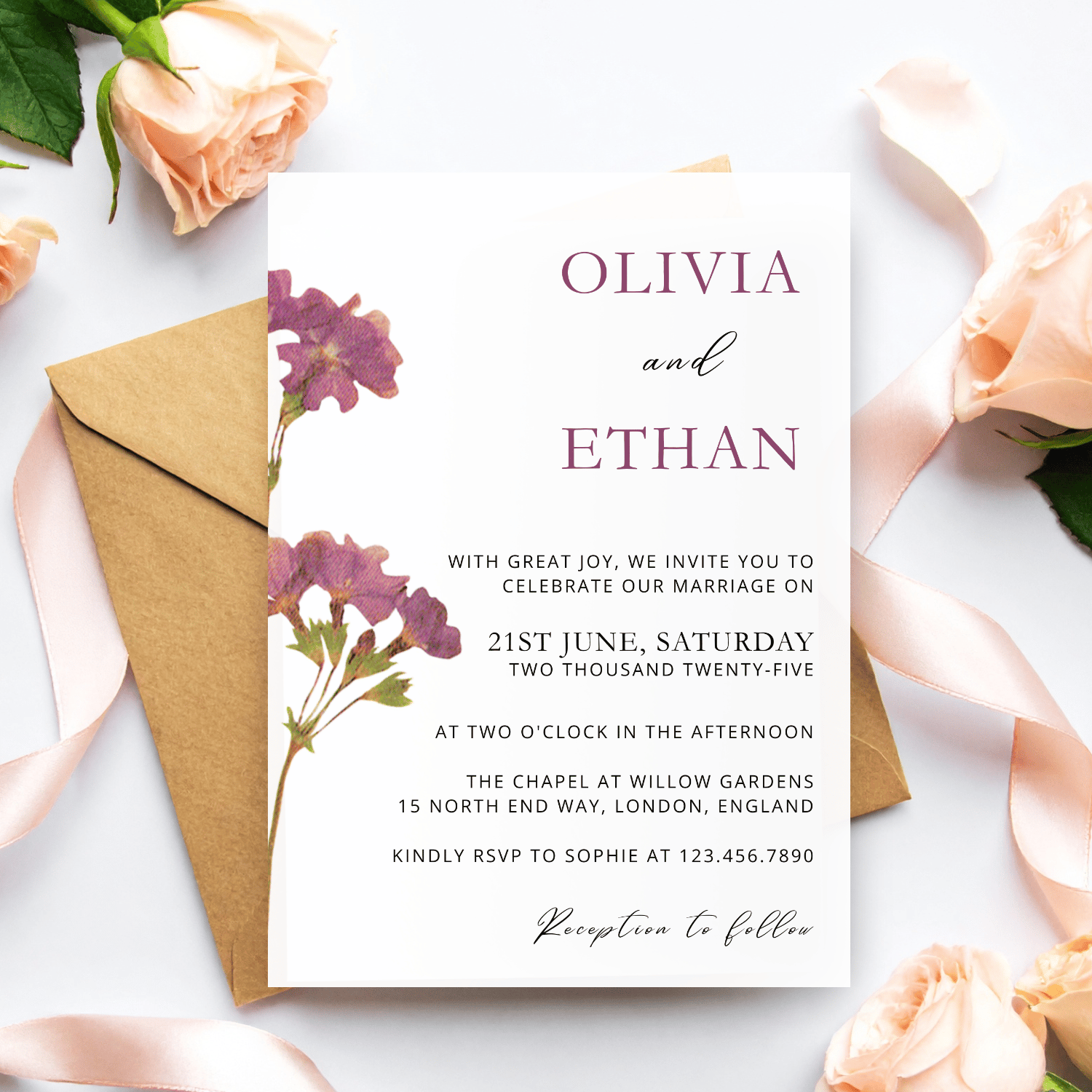 This purple petunia floral wedding invitation template is designed for couples who want an elegant look they can customize themselves that is perfect for romantic and garden-themed wedding.