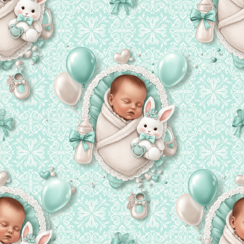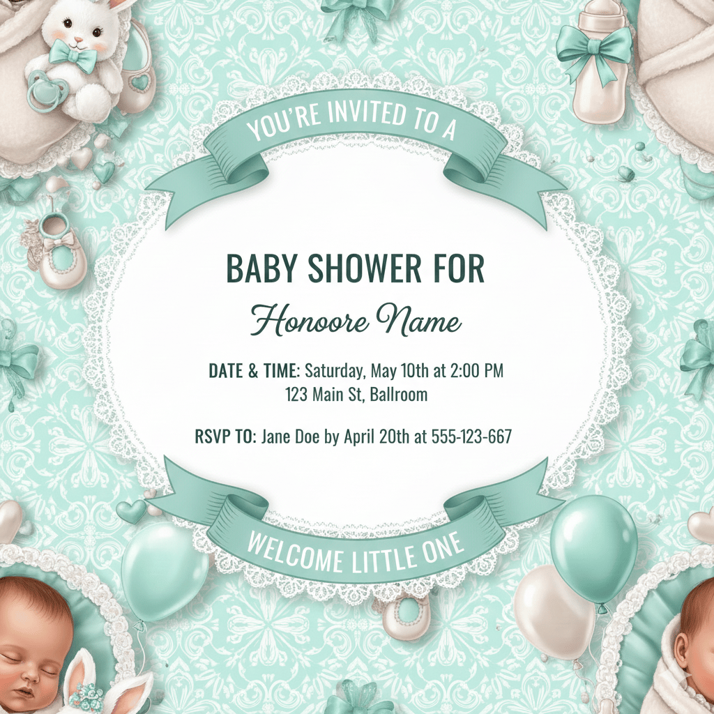 Designed around a classic mint baby shower theme, this generator guides you in creating invitations featuring sleeping newborns, bunny plushies, lace frames, pastel balloons, baby bottles, and elegant ribbon banners. Perfect for baby boy, girl, or gender-neutral celebrations.