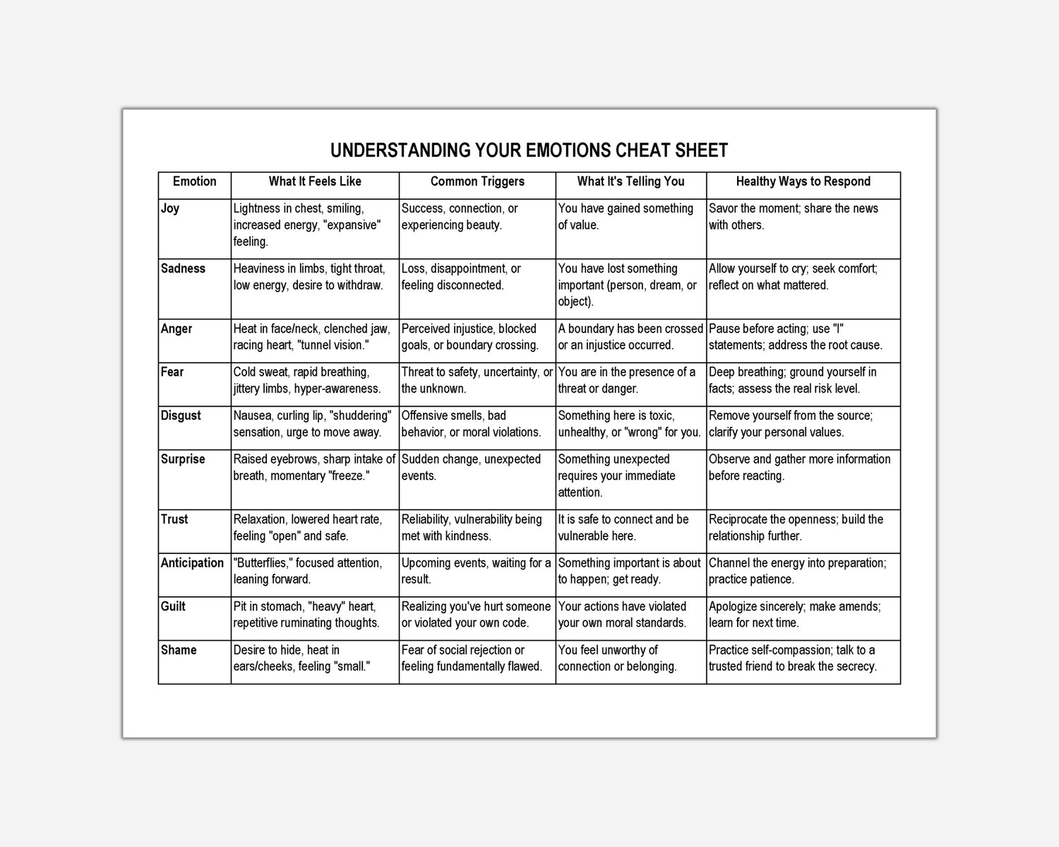 This Understanding Your Emotions Cheat Sheet provides a helpful overview for quick reference. Use it as a guide to support understanding, reflection, and skill-building.