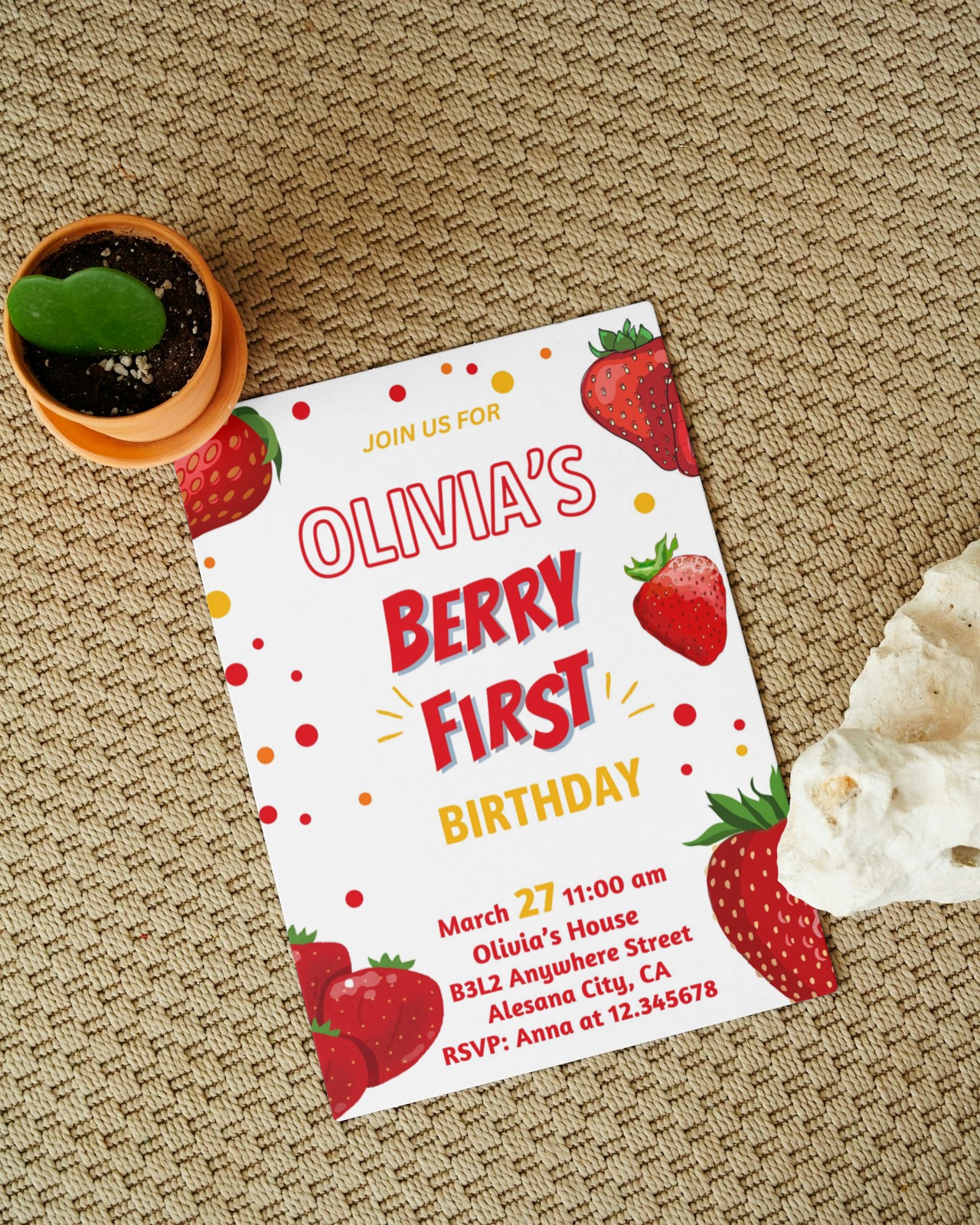 Strawberry First Birthday Invite, Editable Strawberry Birthday Invitation Template, Strawberry Invitation, Berry First Invitation, Strawberry Party