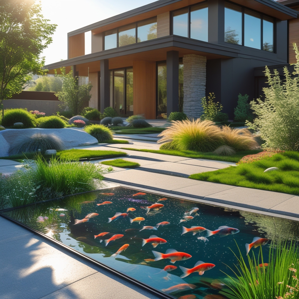 "Stunning large outdoor fish pond seamlessly integrated into a modern house, featuring a clear glass front panel that showcases colorful fish swimming inside. The pond is surrounded by beautifully landscaped greenery, including flowering plants, ornamental grasses, and smooth stone pathways. Natural sunlight reflects off the water, creating sparkling highlights. The house behind the pond has sleek modern architecture with large windows and wooden or stone accents. Tranquil and serene atmosphere, with high attention to realistic textures, reflections, and vibrant colors, cinematic angle emphasizing both the pond and its surroundings."