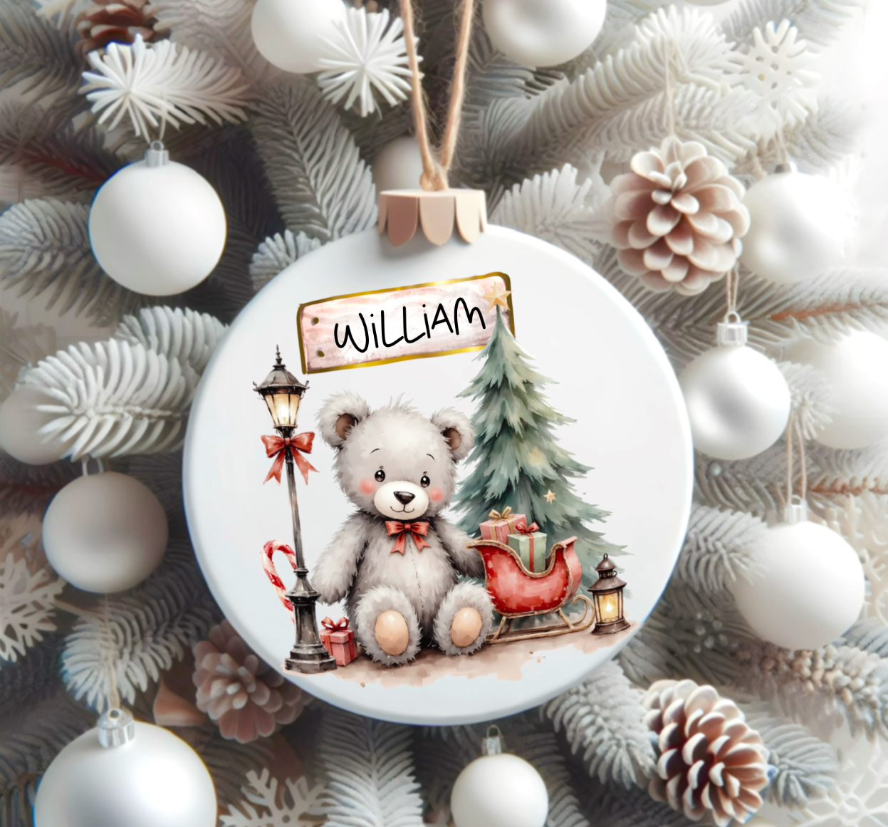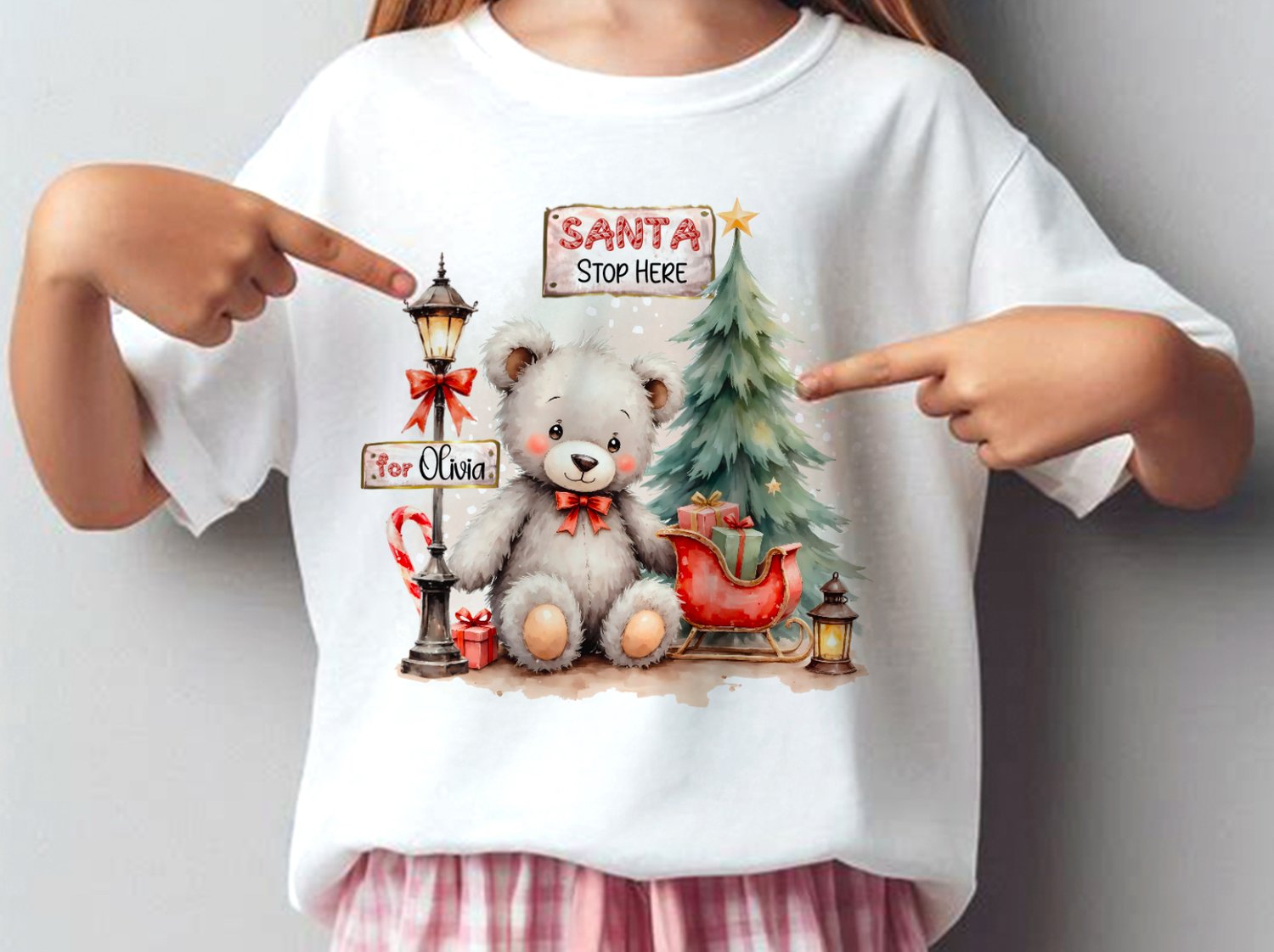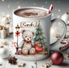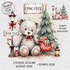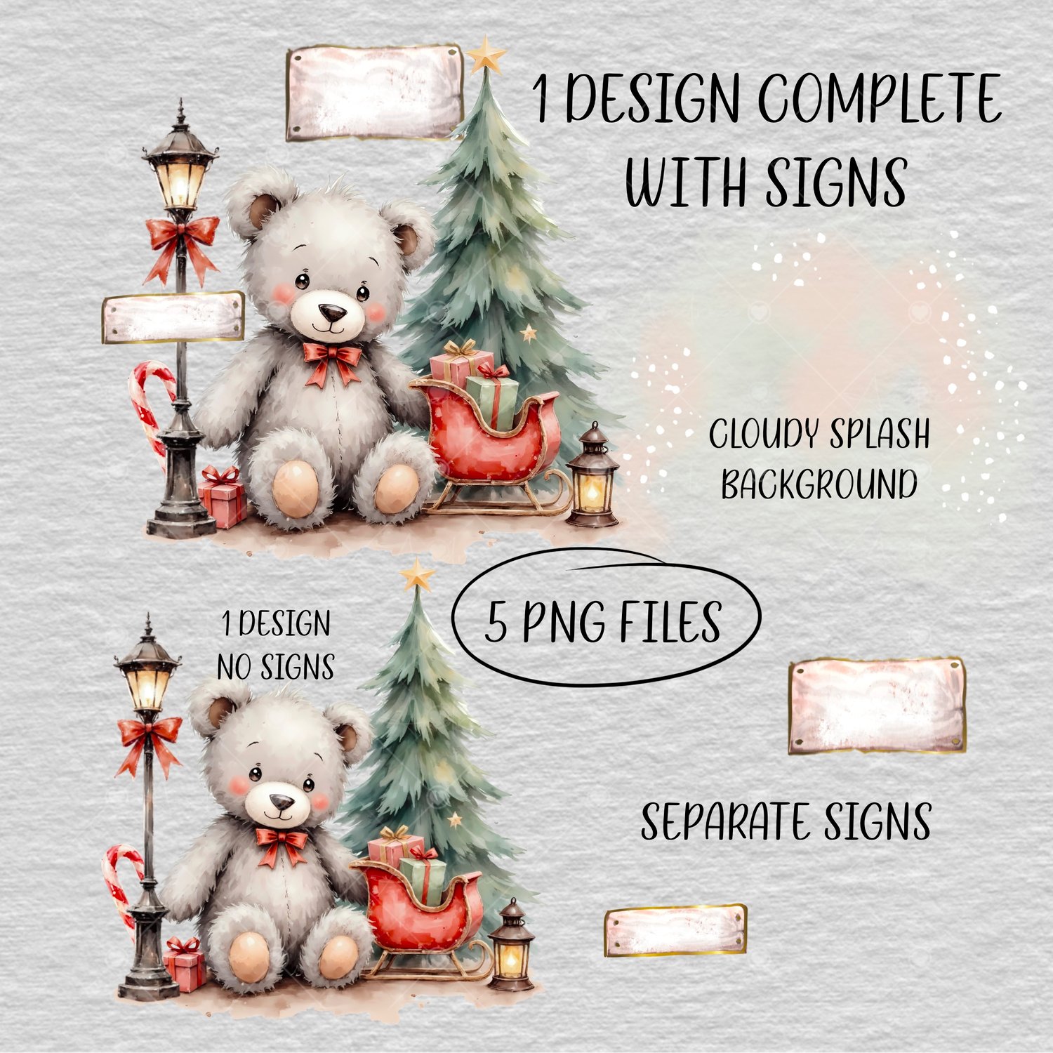 Watercolour Christmas scene, adorable grey teddy bear with\without signs to personalise. Cards, clothing etc. Sublimation, print, DTF, UVDTF. 5 x Christmas PNG.
