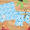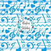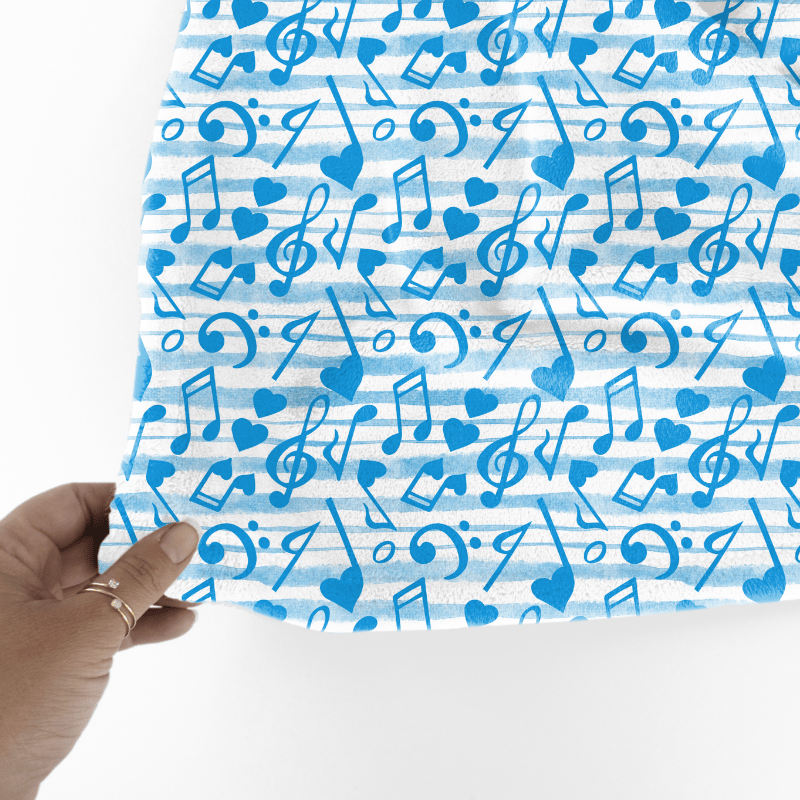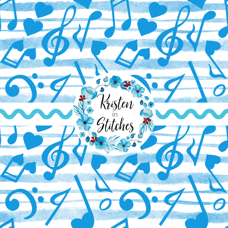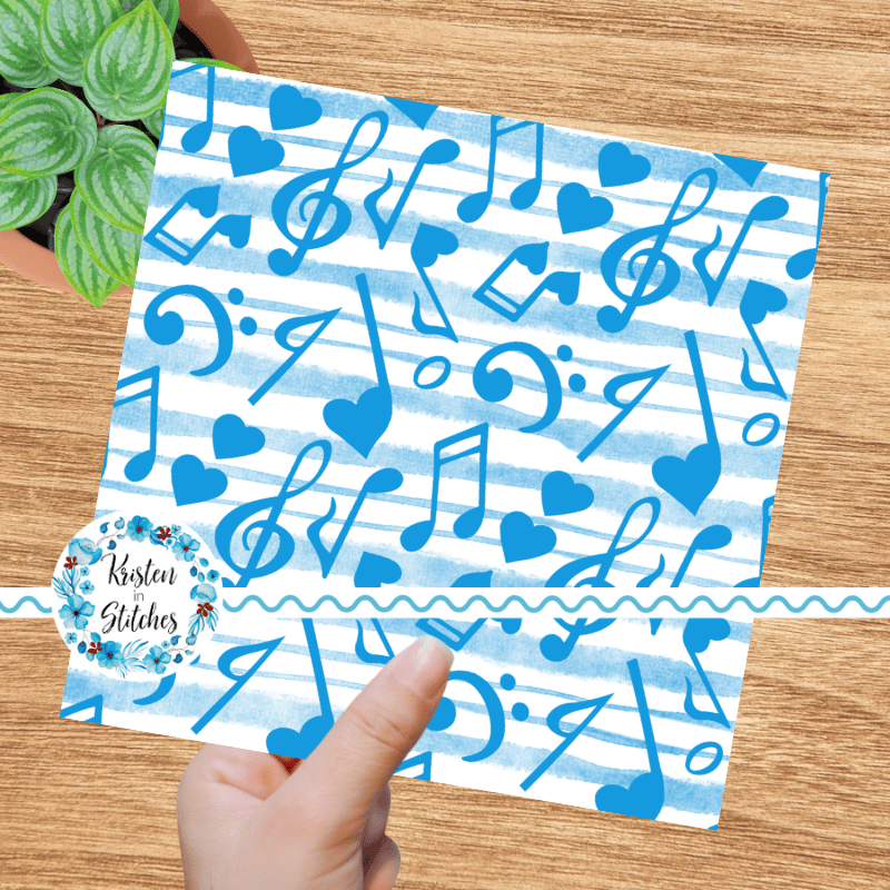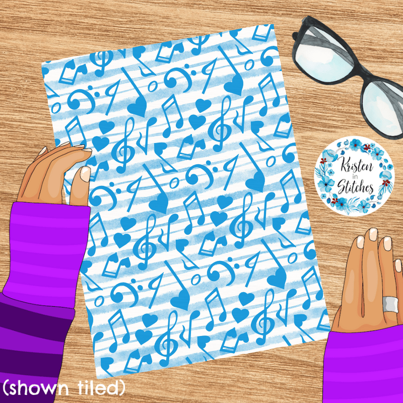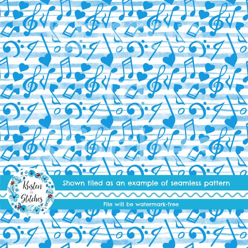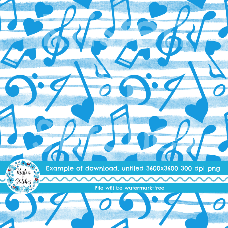Music Love Notes Seamless Pattern, Blue Valentine Hearts Watercolor Stripes