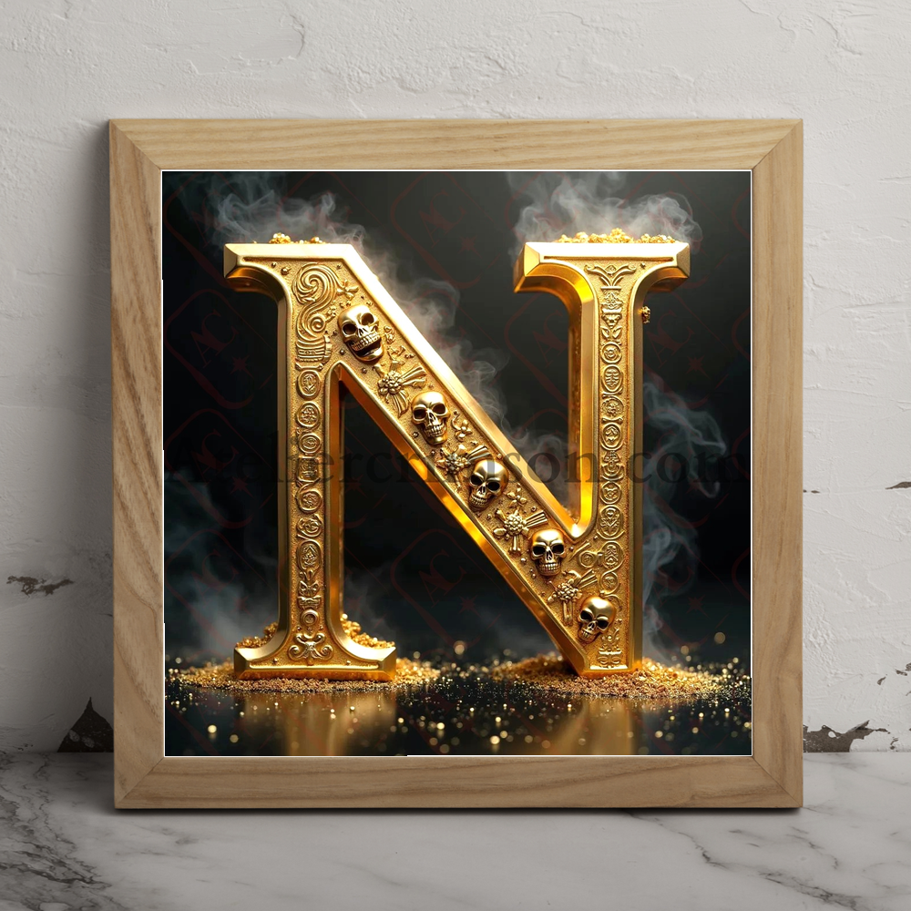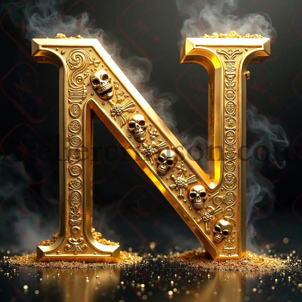 The letter N gold maya skull Skull-inspired engravings, hyper-realistic rendering. Mystical atmosphere with subtle smoke effects. Perfect for high-end typography and design projects. GoldTypography LuxuryDesign SkullArt"