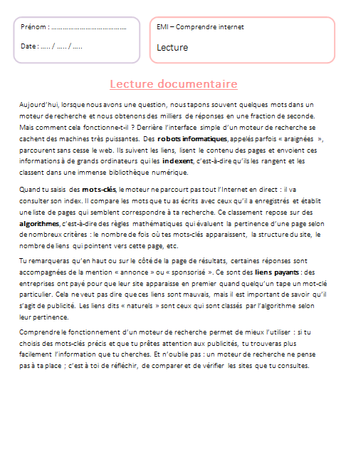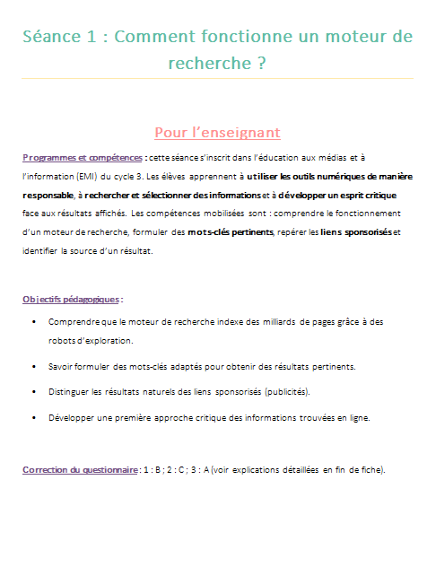 Cette sĂ©quence complĂšte de 4 sĂ©ances EMI pour le Cycle 3 permet dâaider vos Ă©lĂšves Ă comprendre comment fonctionne Internet et Ă dĂ©velopper des rĂ©flexes essentiels pour rechercher, trier et questionner lâinformation.