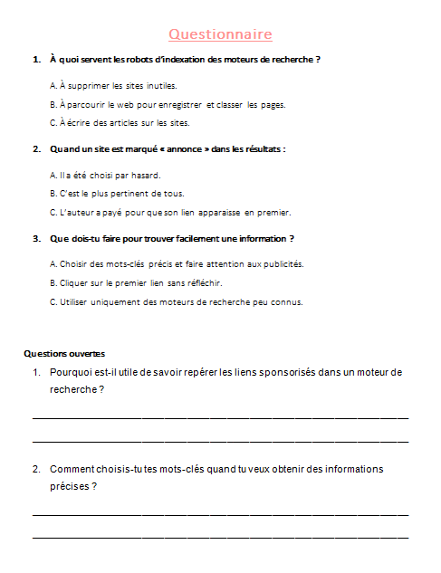- Un questionnaire élÚve (QCM + questions ouvertes)