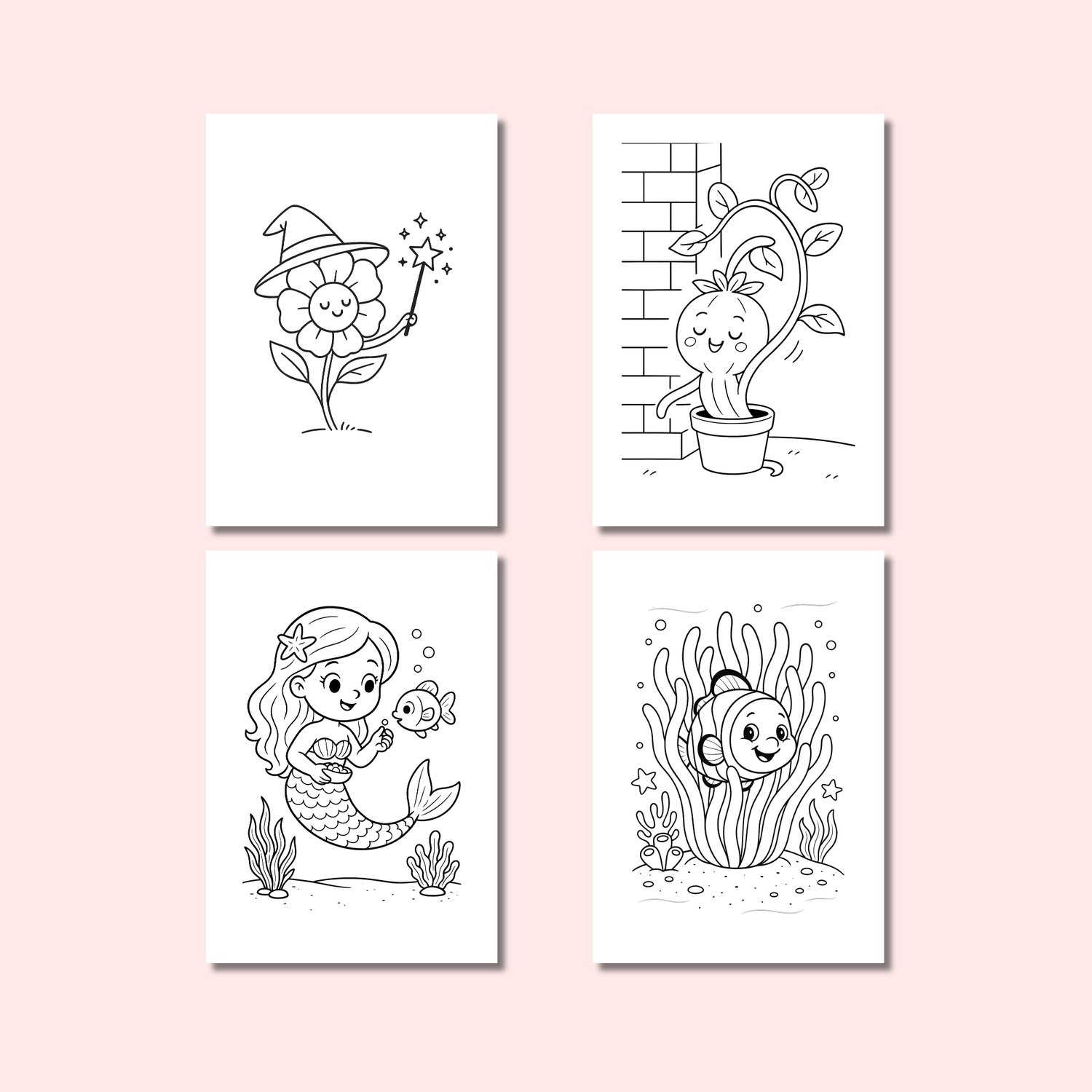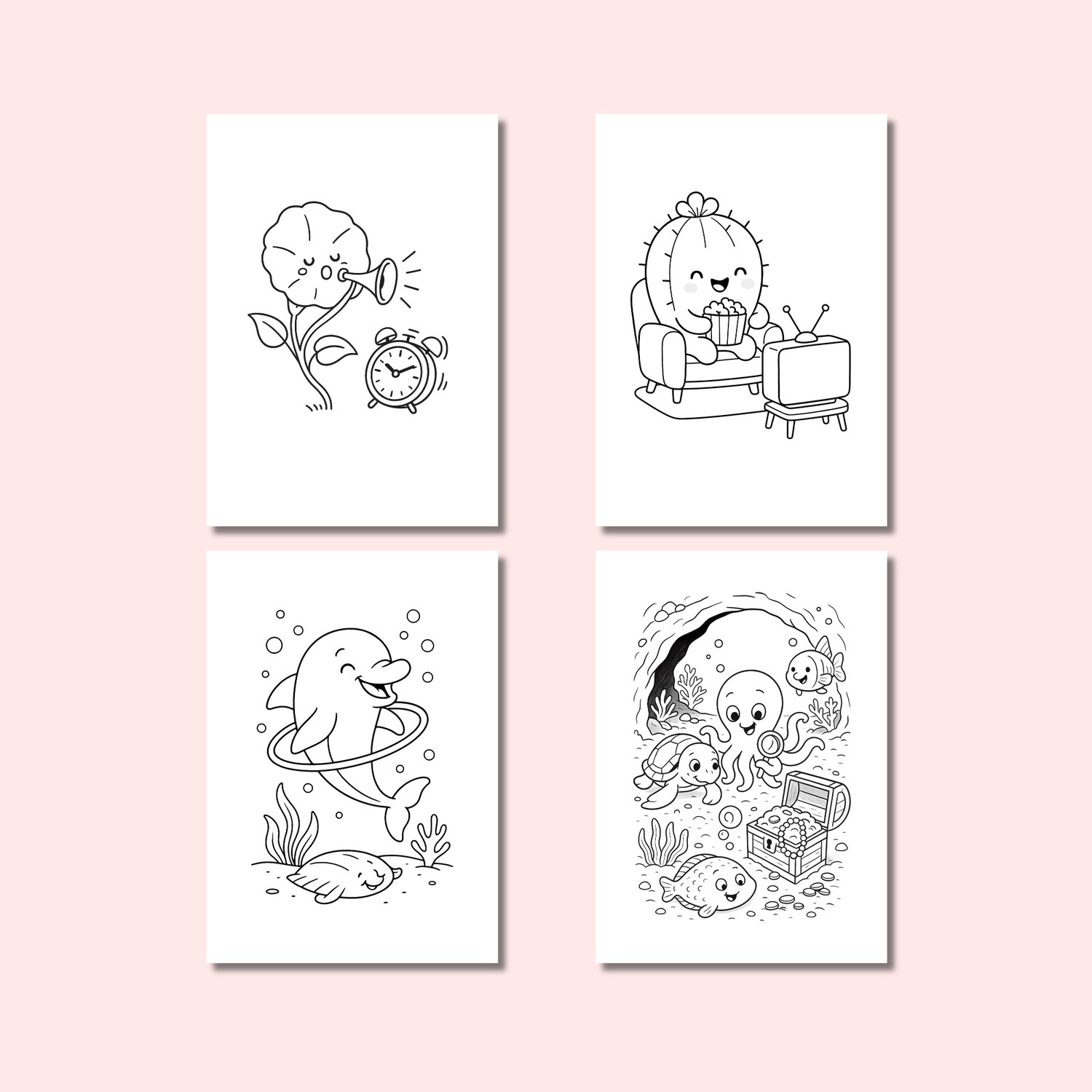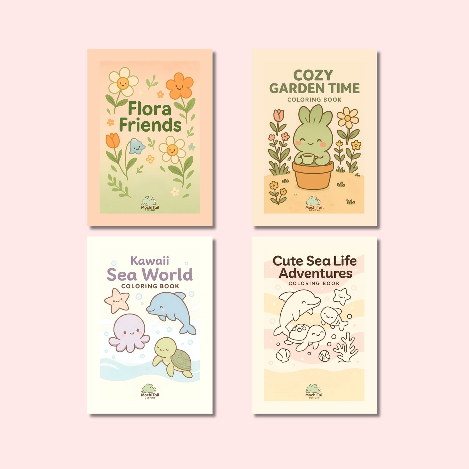 This adorable set includes 4 mini kawaii-style coloring books, featuring happy plants, cozy potted greens, friendly sea animals, and charming underwater scenes.