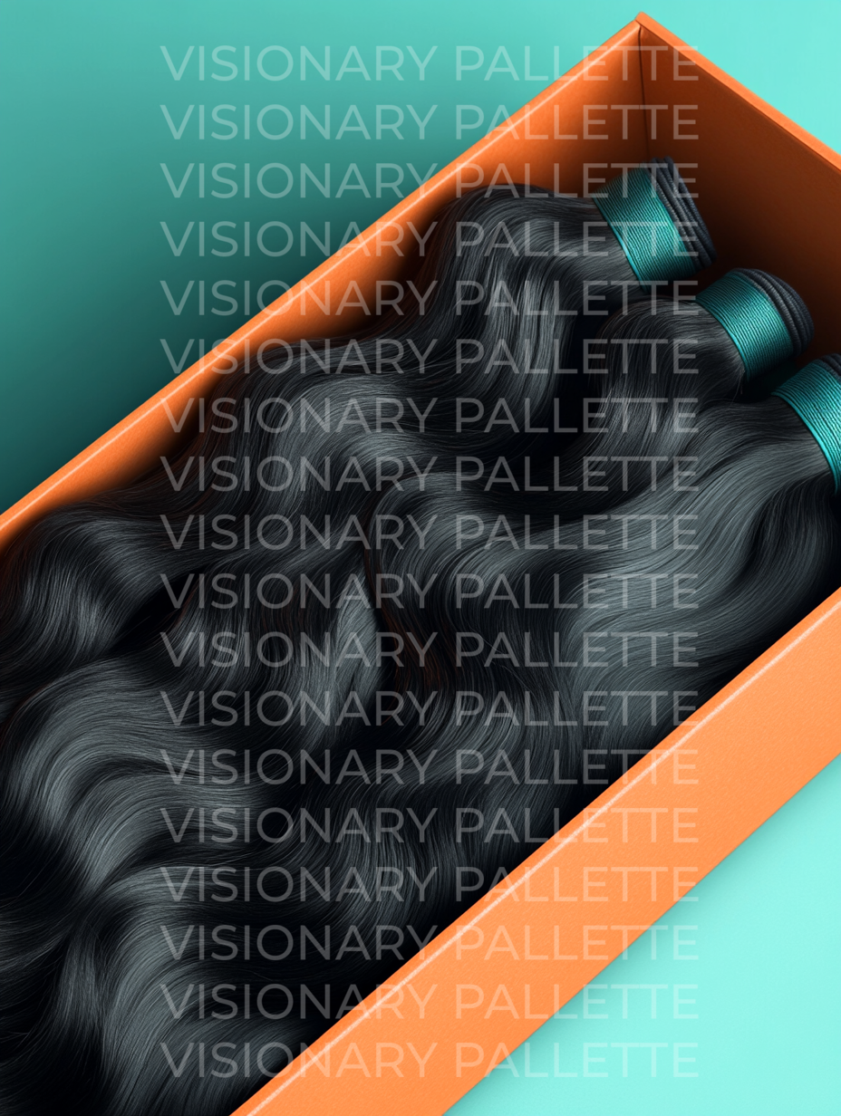 A realistic Teal and Orange Open subscription box with realistic black Wavy hair bundles inside