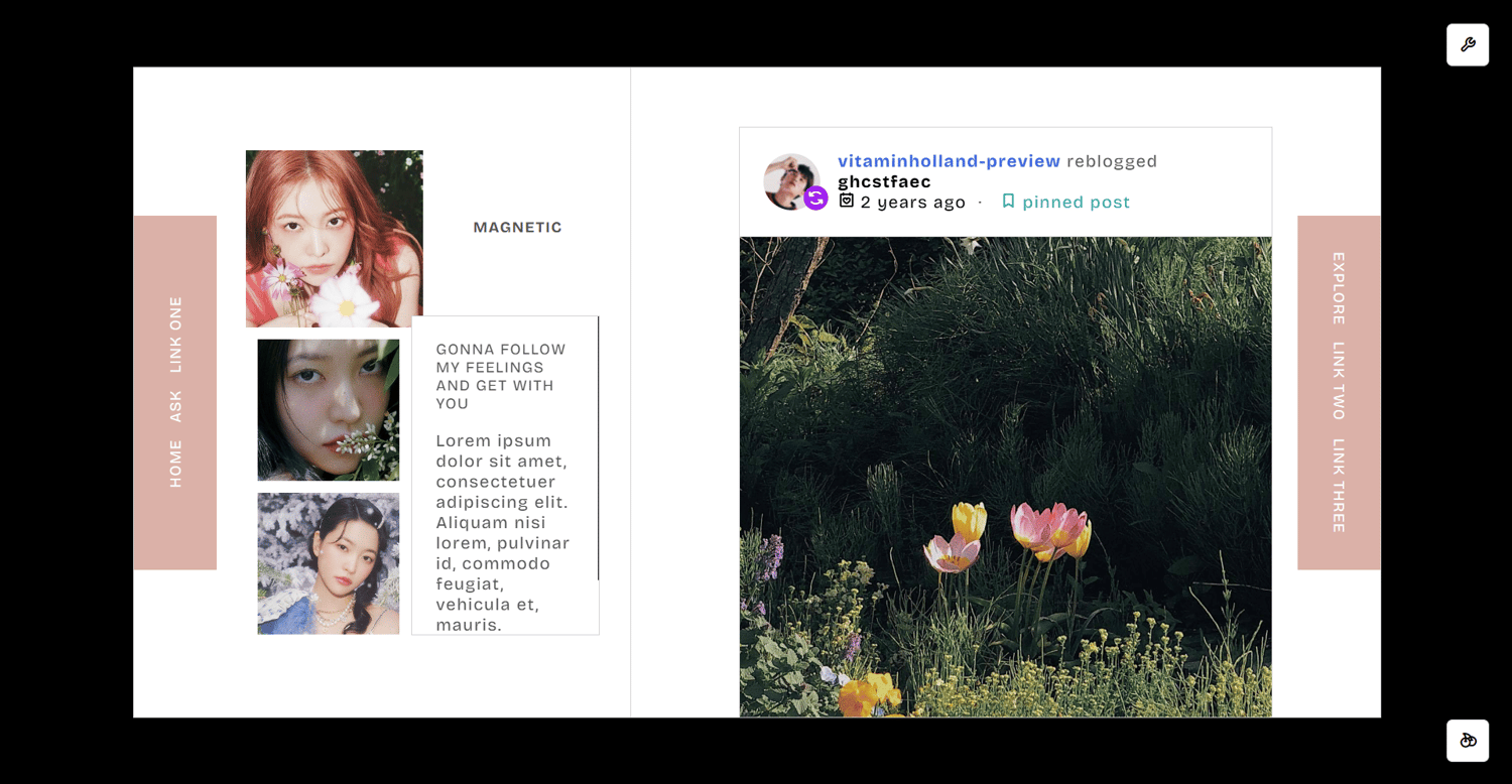 features: 150x150px main image, two 120x120px icon images, blog title, blog subtitle, three custom links, about quote, 410x200px about image, three 100x100px about icon images, about section with about info, muses section with 80x80px muse image, details and short description, 450px text posts
