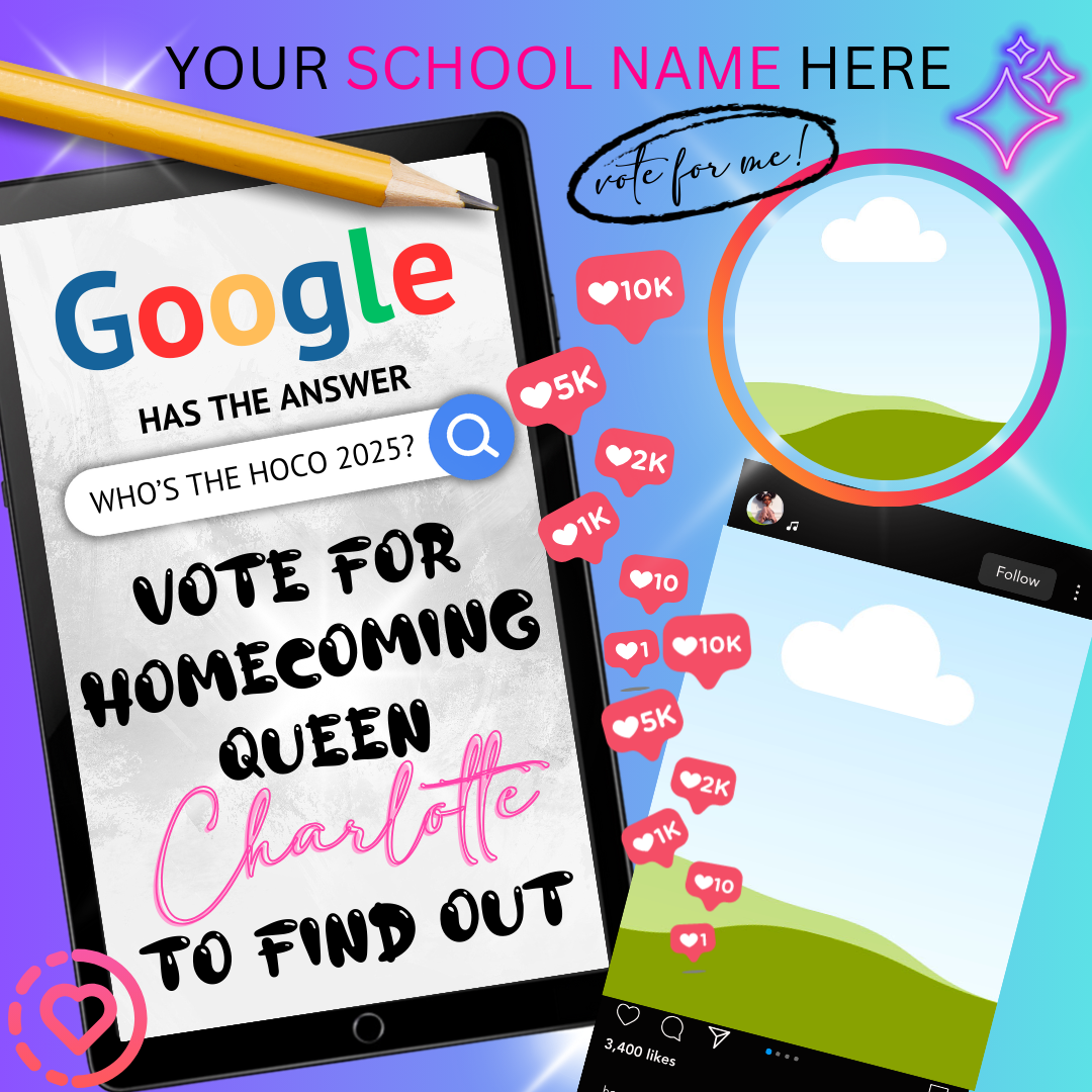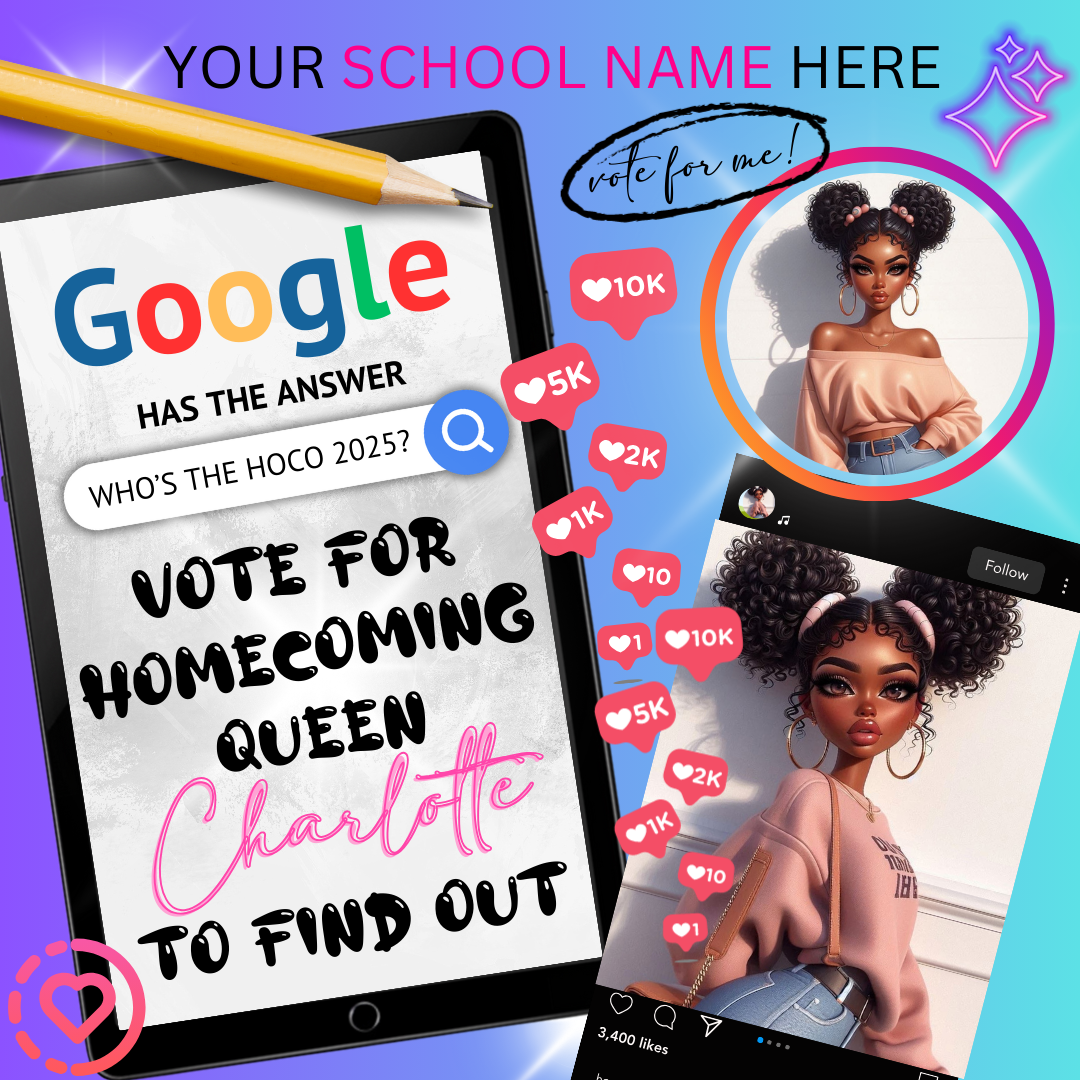 Elevate your homecoming campaign with our professionally designed Google Homecoming Flyer from MorCelebrations. Perfect for that crucial vote for homecoming queen, this campaign flyer combines eye-catching aesthetics and persuasive messaging.