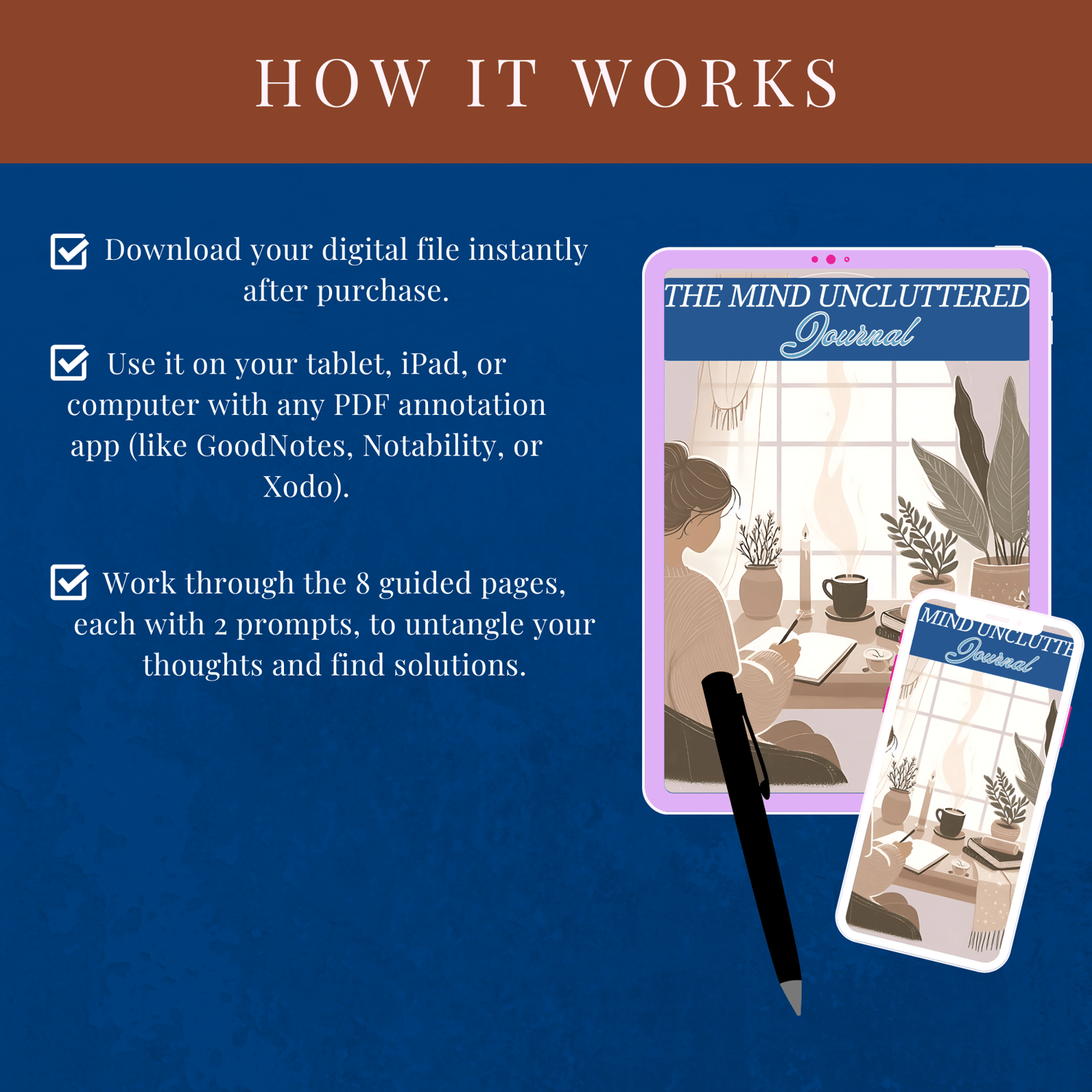 Feeling stuck? Overthinking? Say hello to The Mind Uncluttered Journal—your guided digital journal that helps you clear the mental clutter and actually solve your problems. ✨