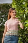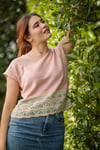This t-shirt is worked bottom-up in two pieces, front and back, which are seamed together at the end. Begin by knitting the lace hem, then continue in stockinette stitch with increases to shape the armholes. On the front, the stitches are divided at the neckline, shoulders are shaped using short rows and left on hold. On the back, the work is divided to create a keyhole opening where a button will be sewn. Shoulders are also shaped with short rows and joined with the corresponding front stitches using a three-needle bind-off. Finally, front and back are seamed together.