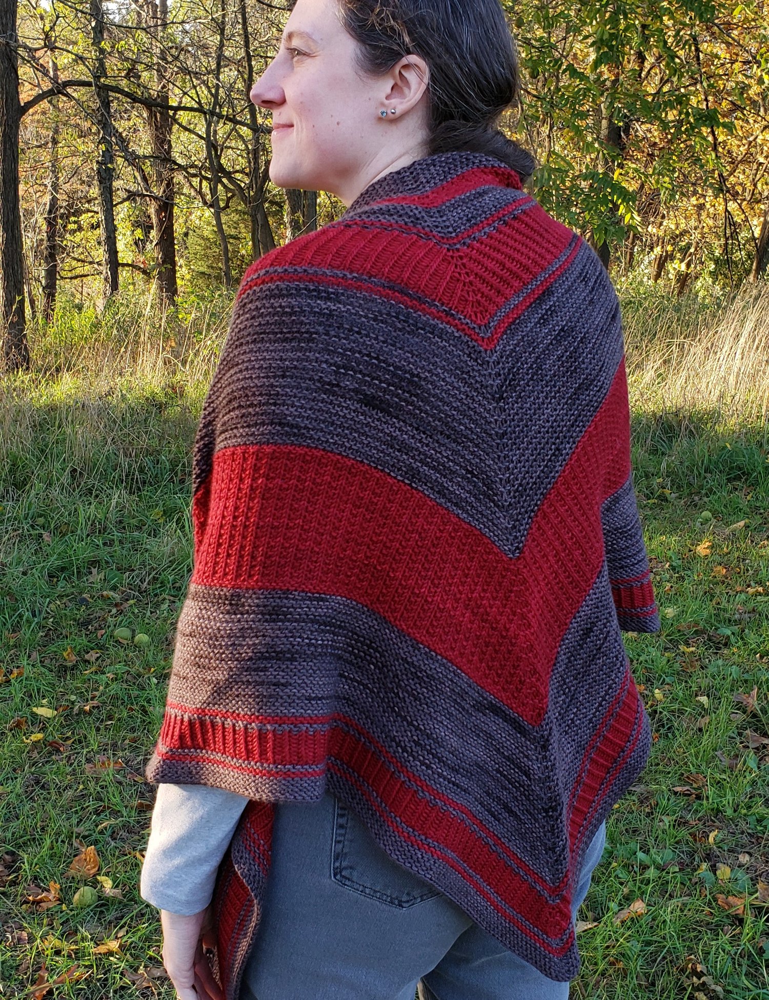 This large, snuggly, triangular shawl is perfect for those evenings in September when things start to cool down. Fun stripes and changing textures make for an engaging knit. Wrap up in your favorite fall colors!