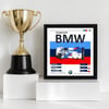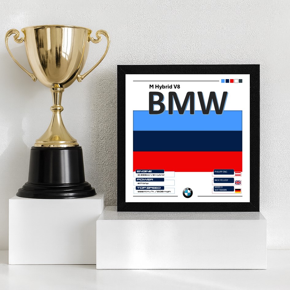 💙 Avec un fond inspiré du design officiel BMW Motorsport, cette affiche reprend les couleurs emblématiques bleu, rouge et noir pour un rendu élégant et moderne.