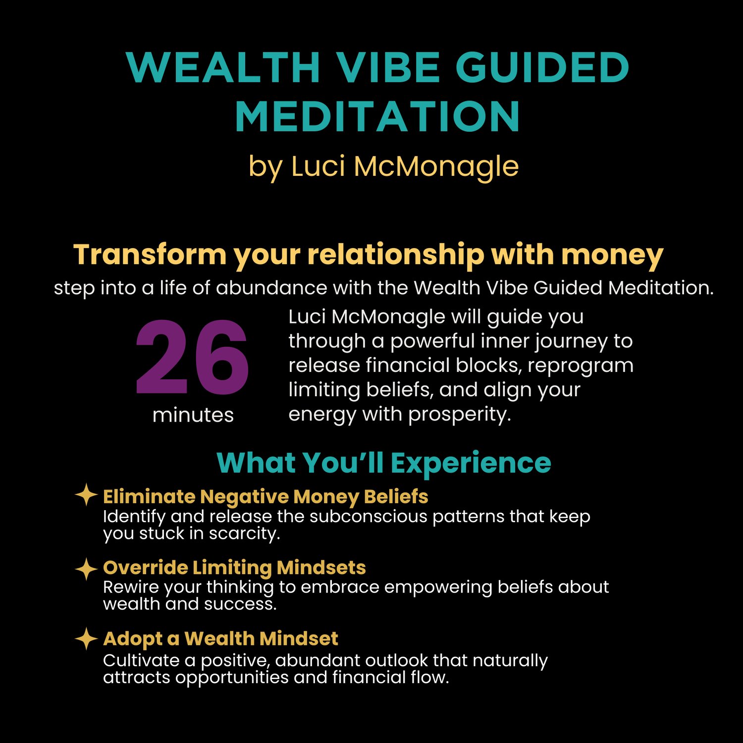 Transform your relationship with money and step into a life of abundance with the Wealth Vibe Guided Meditation. In just 26 minutes, Luci McMonagle will guide you through a powerful inner journey to release financial blocks, reprogram limiting beliefs, and align your energy with prosperity.