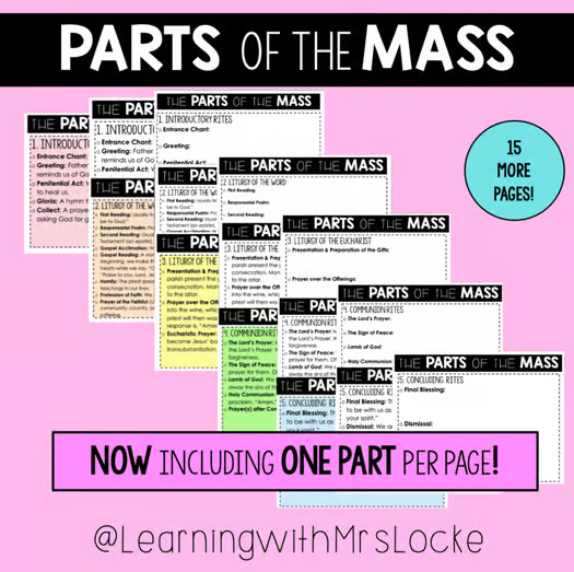 This versatile resource helps students learn and remember the sections of the Catholic Mass in a variety of engaging formats. Whether you want an interactive notebook page, poster, study guide, assessment, or worksheet, you’ll have multiple versions to meet your needs for any grade level — from elementary through high school.