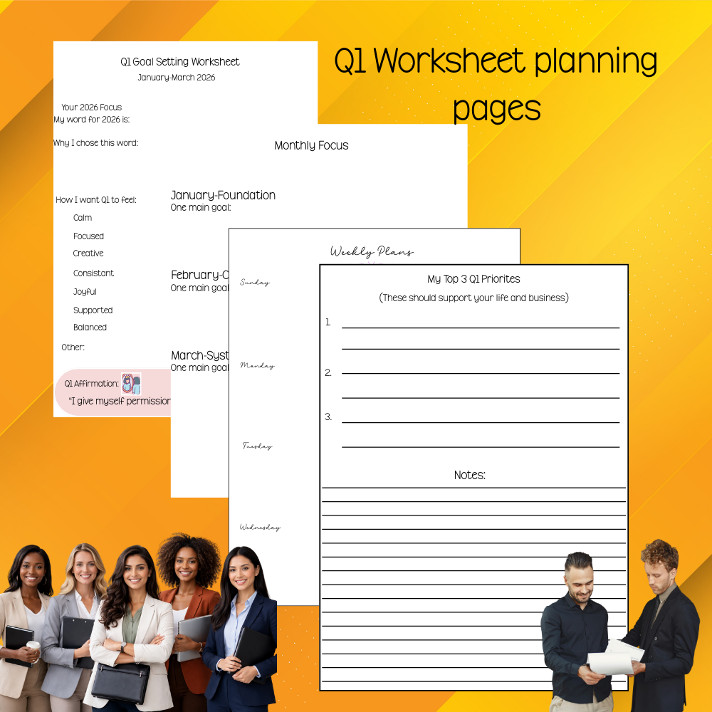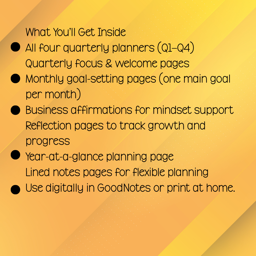 Instead of planning an entire year at once, this planner allows you to move through your business journey one focused quarter at a time—helping you stay aligned, consistent, and confident without overwhelm.