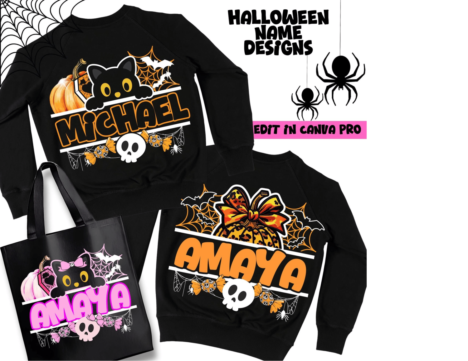 Get spooky and stylish with this set of 10 editable Halloween name templates 👻🎉 Perfect for customizing shirts, tote bags, mugs, and other merch! These Canva Pro templates make it easy to add your own names or text and create fun, festive designs for Halloween.