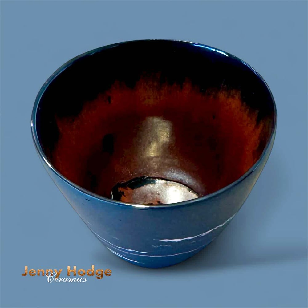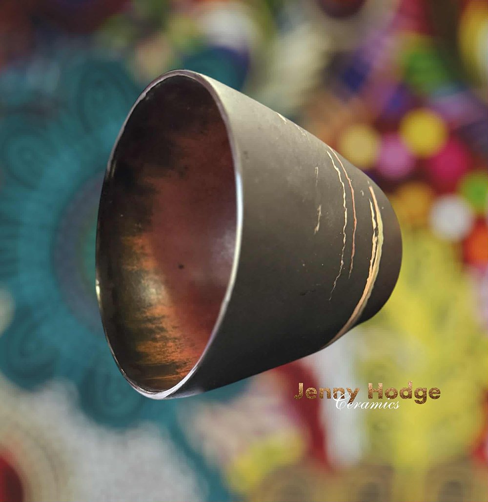 Adorable black coffee cup which is lovely and light to hold. Stunning raw black clay on outside with super gold/bronze glaze inside.