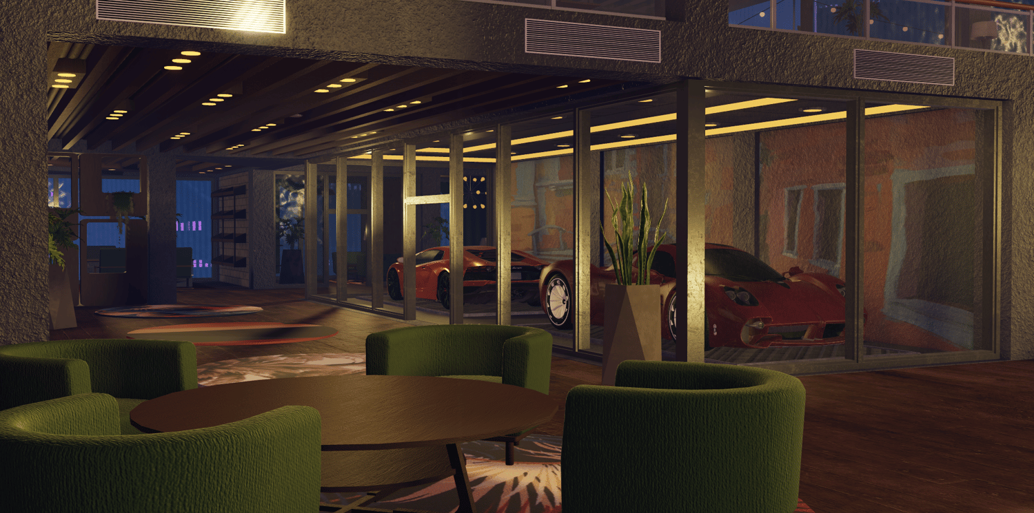 - 🏎️ Private Car Gallery: Integrated indoor showroom with glass partitions to display your high-end vehicles.