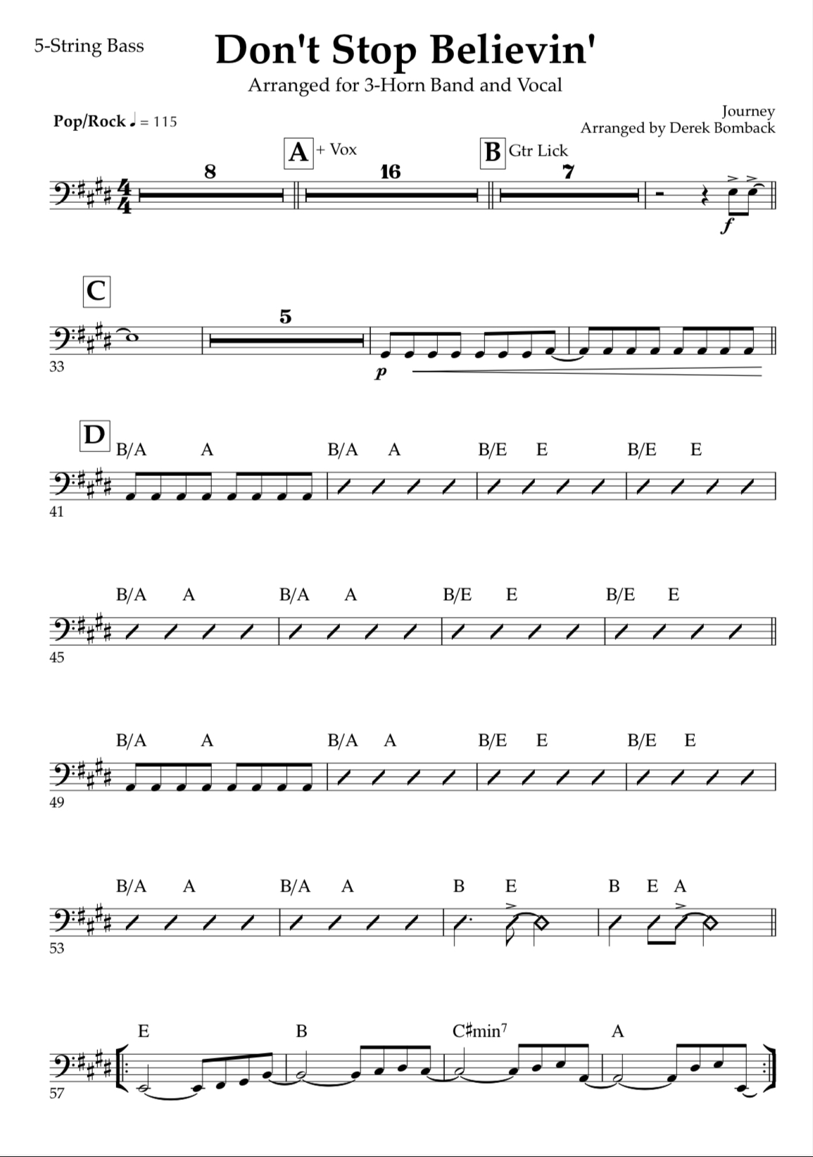 Don't Stop Believing by Journey. Key of E major. Arranged for 3 horn band and vocal (Trumpet, Tenor Sax, Trombone, Guitar, Piano, Bass Guitar, Drums & Lyric Sheet).