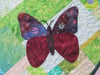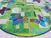 This stunning table topper is made with a scrappy green background and added appliqué batik fabric butterflies on top. The appliqué butterflies are blanket stitched in place. Meandering quilting adds to the look. This would look fabulous on your round table!