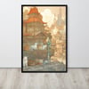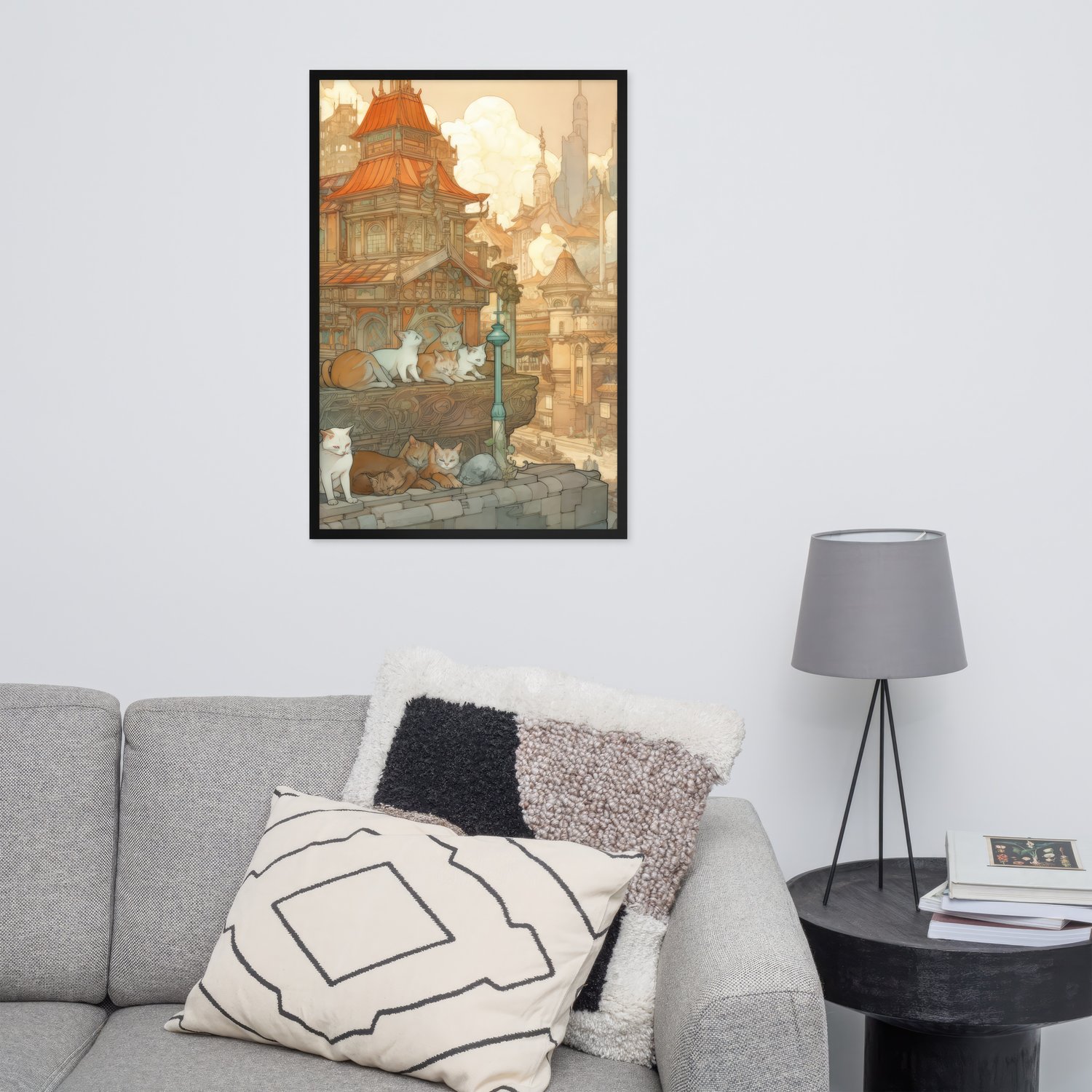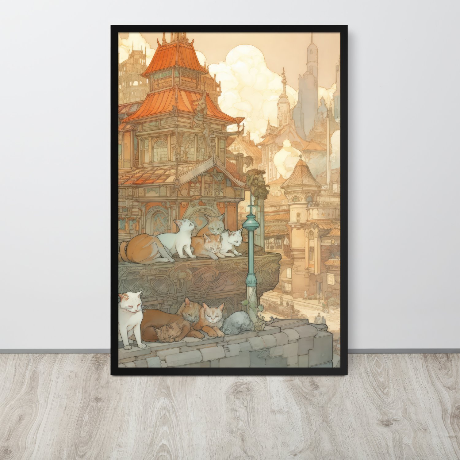 Step into an ancient world of wonder with this intricate Japanese fine line drawing of a traditional building surrounded by playful cats. Add a touch of culture and whimsy to any space with this unique and detailed artwork.