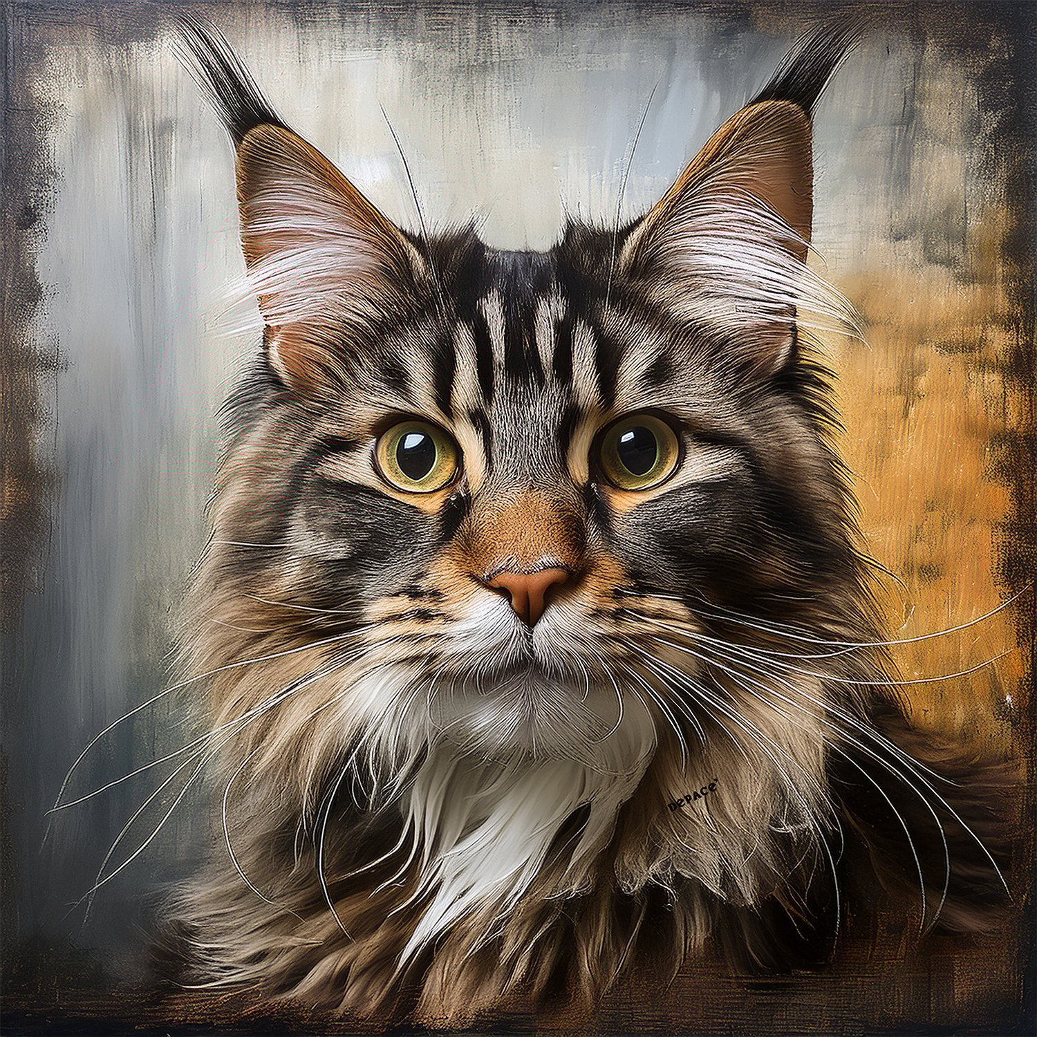 A regal Maine coon cat sits proudly as if guarding a secret gallery of forgotten art, its lush fur echoing the earthy tones and rugged charm of the cracked, streaked paint behind it. The backdrop whispers tales of urban walls kissed by time, while the cat’s piercing gaze draws you into a world where feline grace meets the beauty of decay. This fusion of raw artistry and natural elegance creates a piece that feels both ancient and alive, perfect for anyone who loves the magic of texture and the majesty of cats.
