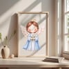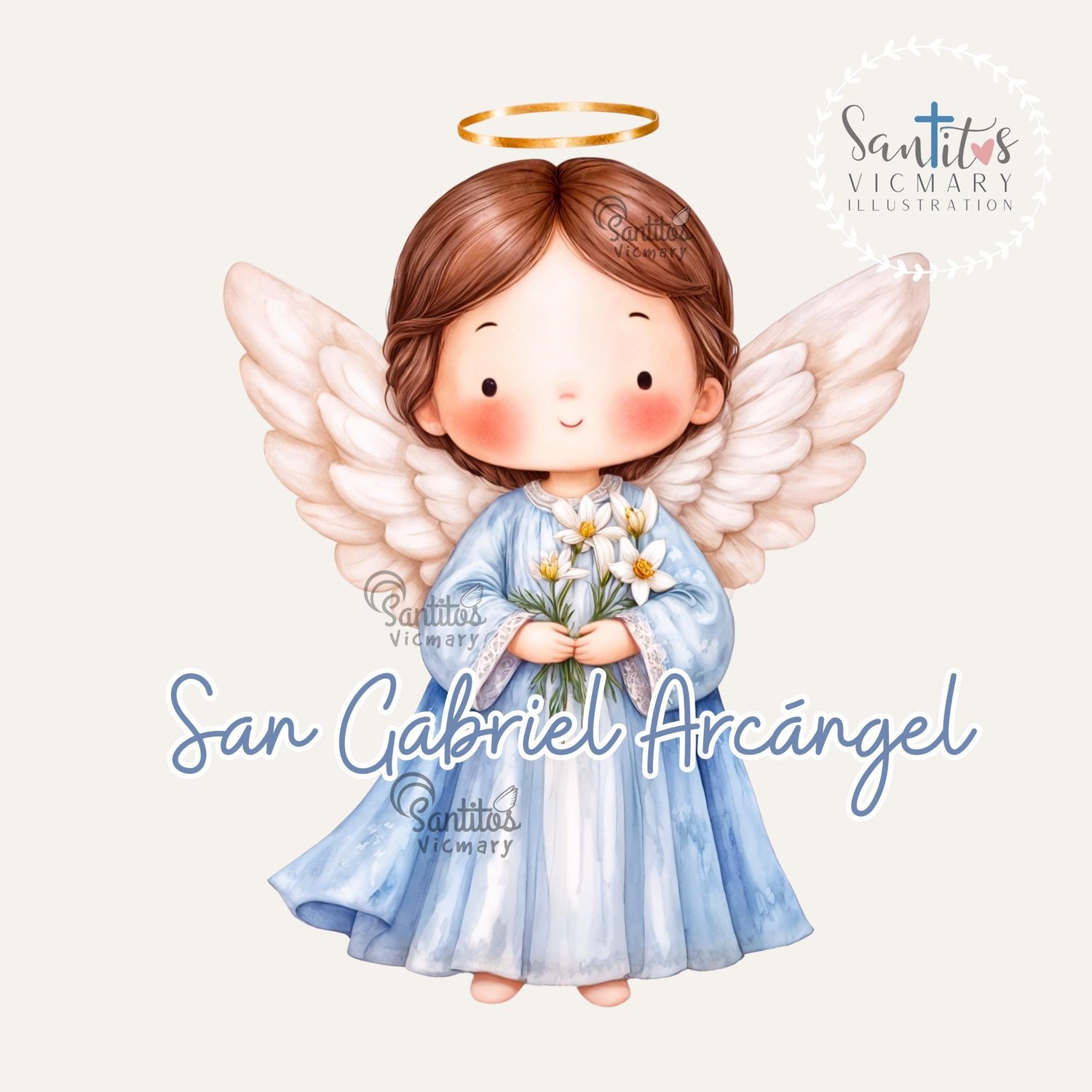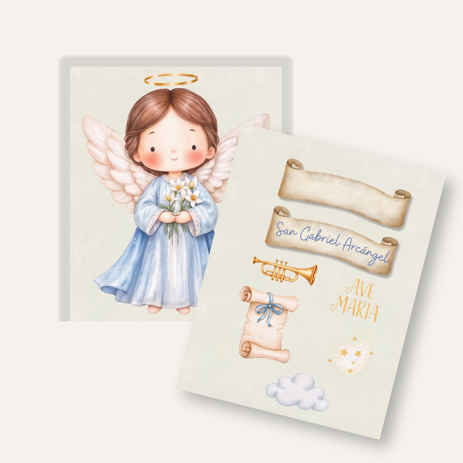 1x Ilustración principal de San Gabriel Arcángel: El ángel con su halo, alas y los lirios en sus manos, en un estilo dulce y moderno. Ideal para estampitas, oraciones, recordatorios y más.