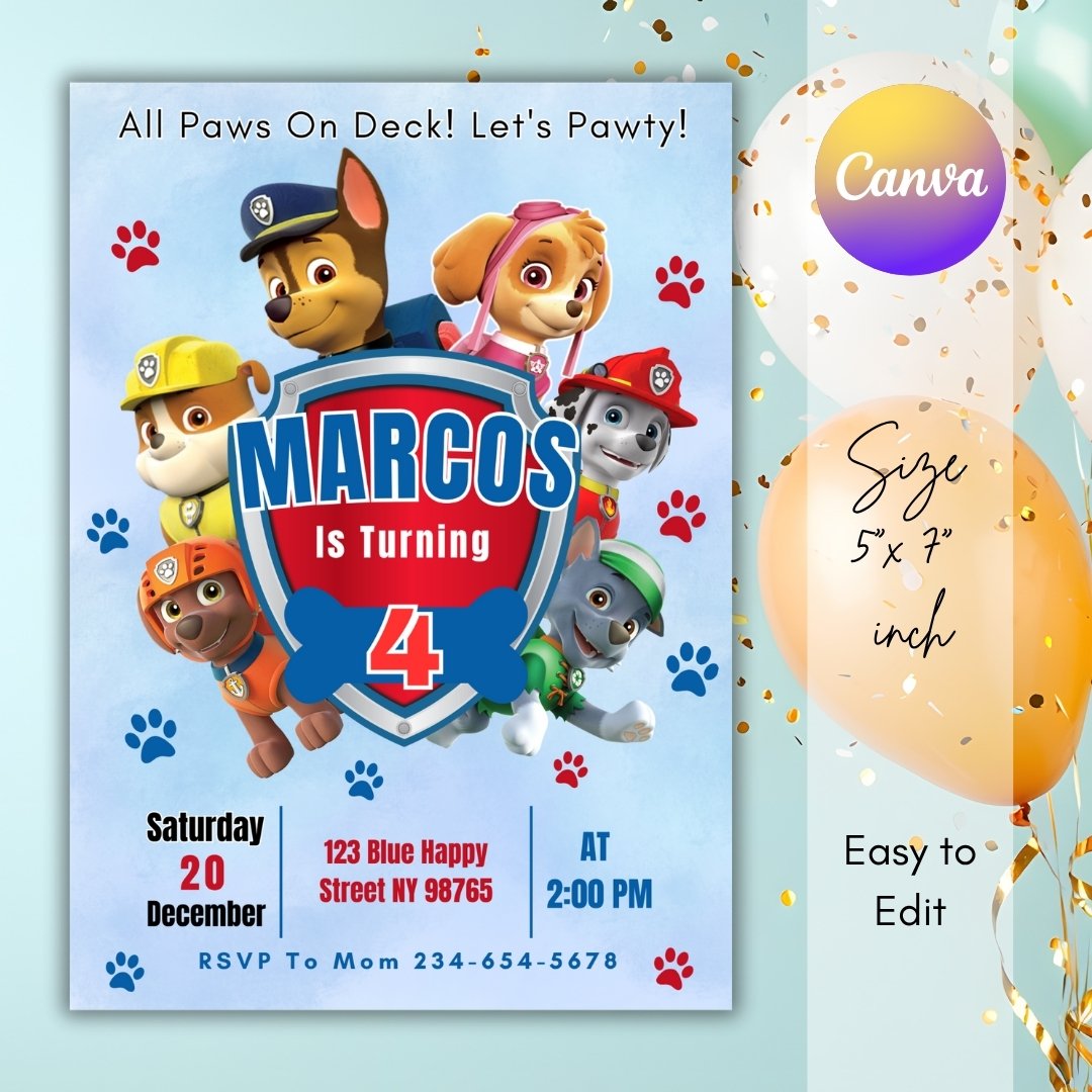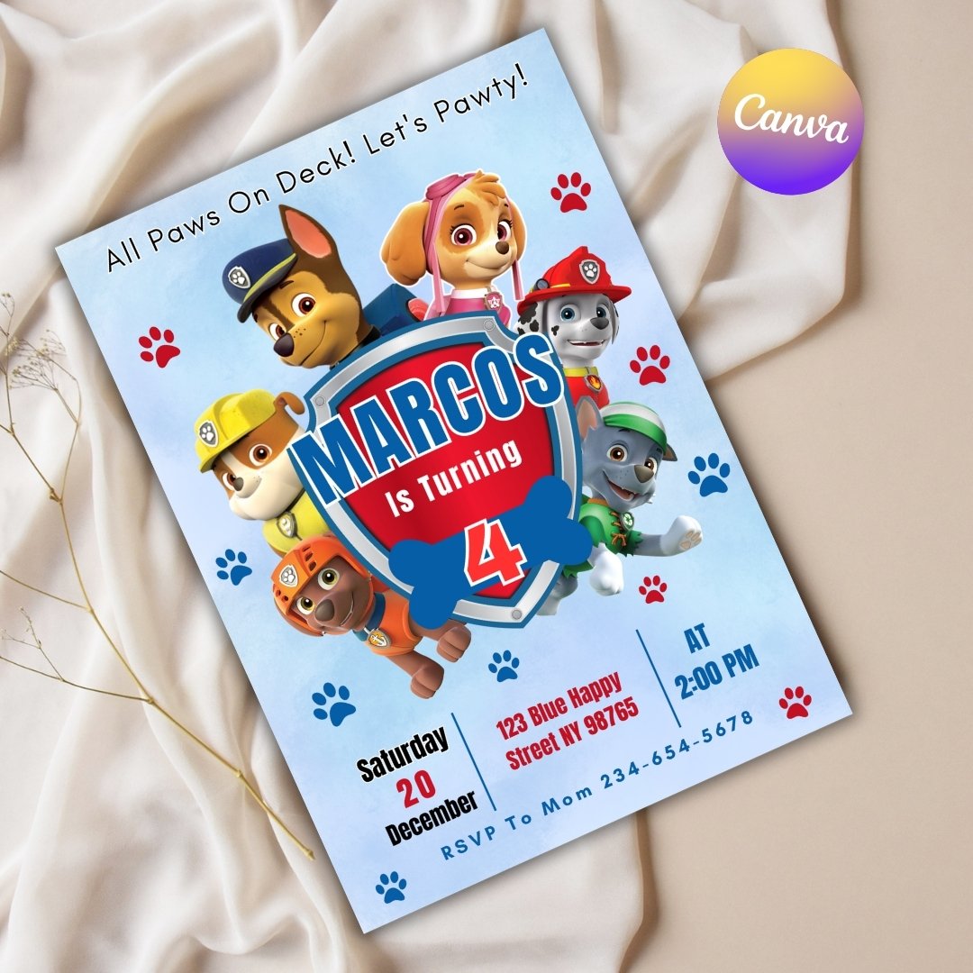 Get ready for a fun and adventurous celebration with this adorable Pawty Patrol-themed birthday invitation! Perfect for kids who love puppies, rescue teams, and action-filled parties. This editable digital invitation is easy to customize directly in Canva, even if you’re a beginner.