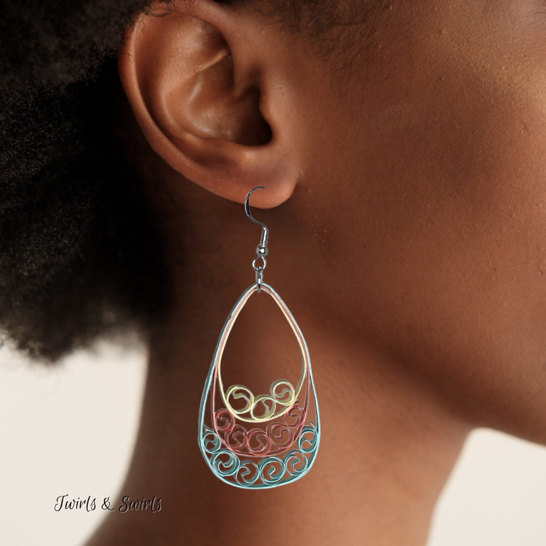 Each swirl is carefully shaped and placed by hand, creating a lightweight piece of wearable art that feels both playful and elegant. The open teardrop shape frames the design, letting the colors and intricate quilling shine through. A little nod to childhood traditions, springtime color, and the beauty of handmade details.