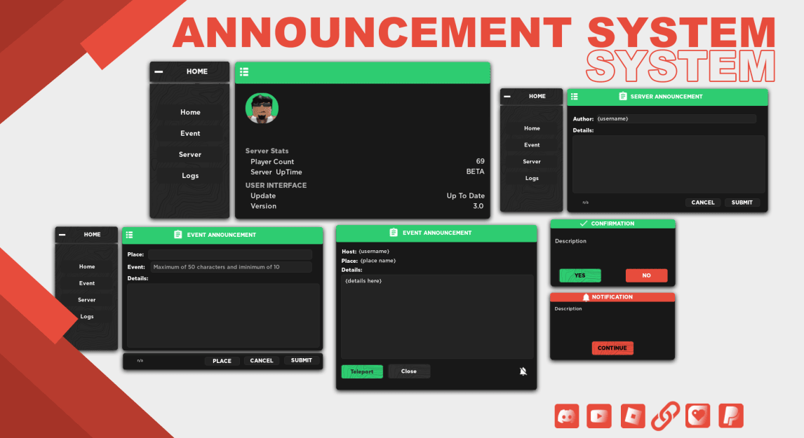 Are you tired of using boring old announcement systems? Want to make your events stand out? Check out our new User Interface! It's not just an announcement GUI, you can also host events and announce them with just a few clicks. It's modern, sleek and super easy to use.