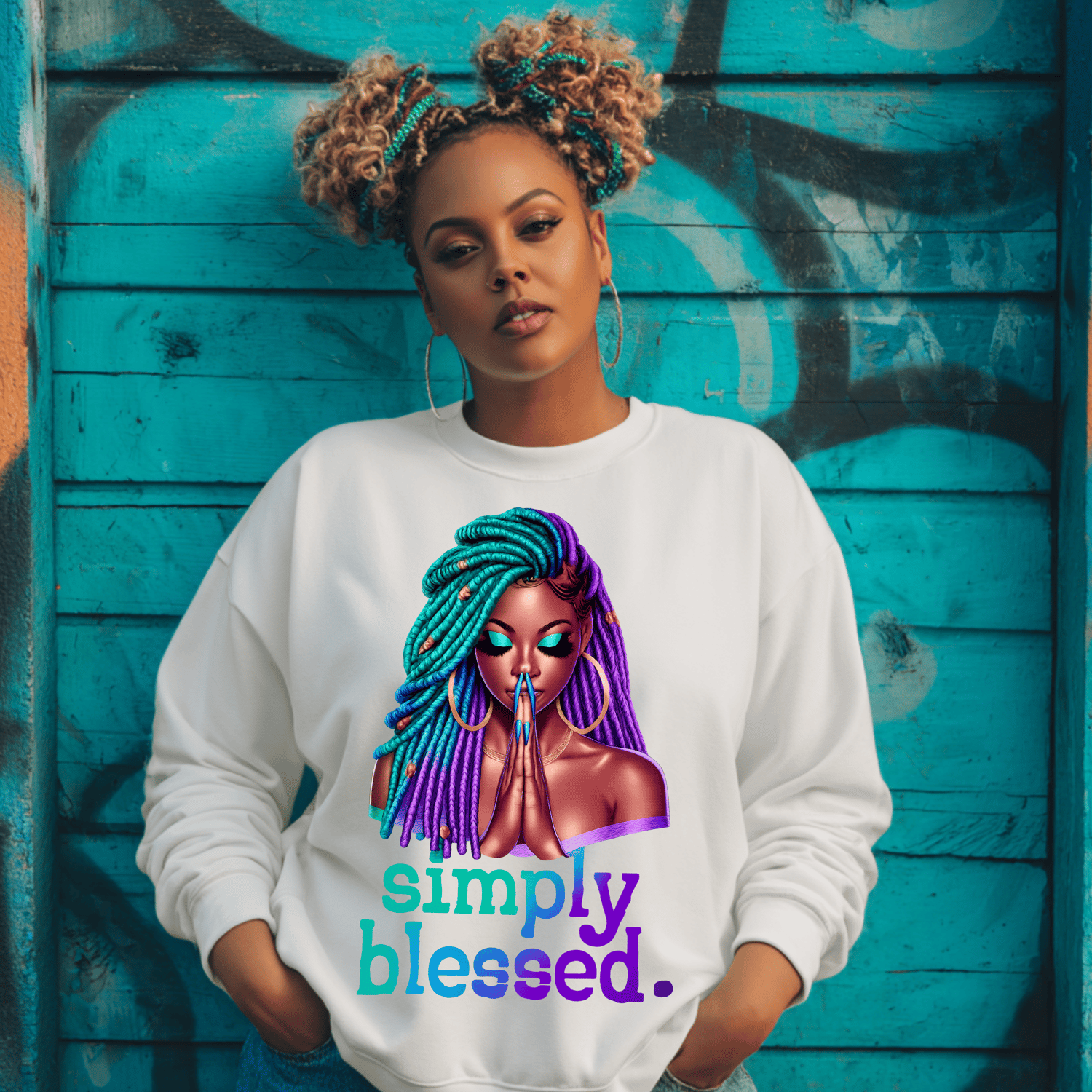 The Simply Blessed design features a stunning praying woman illustration paired with a calm yet confident faith statement. With rich teal and purple tones, detailed locs, and a peaceful prayer pose, this design speaks strength, gratitude, and spiritual confidence without saying too much.