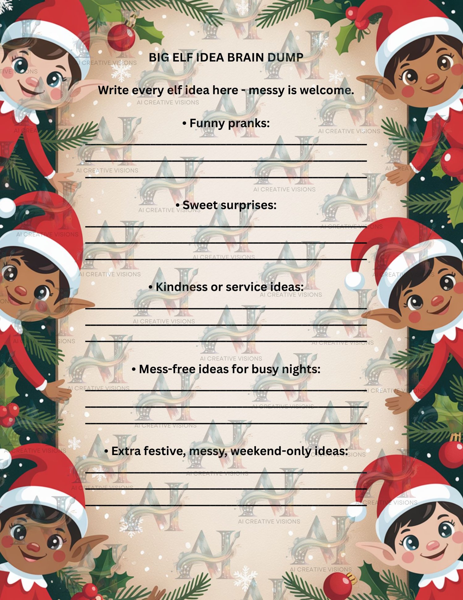 - Big Elf Idea Brain Dump: Pages to write down every idea—funny pranks, sweet surprises, mess-free ideas, and kindness ideas —messy is welcome!