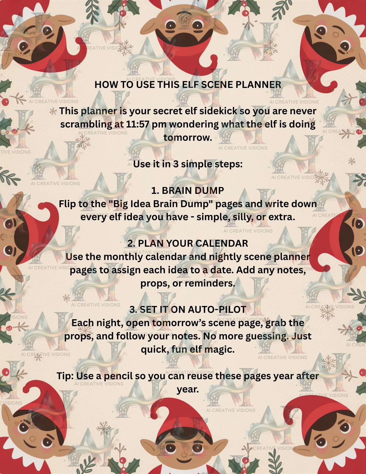 - TONIGHT'S ELF SCENE PLAN: Dedicated pages for nightly planning, including the scene title, quick description, props needed, step-by-step plan, and location (Kitchen, Living room, Bathroom, Bedroom).