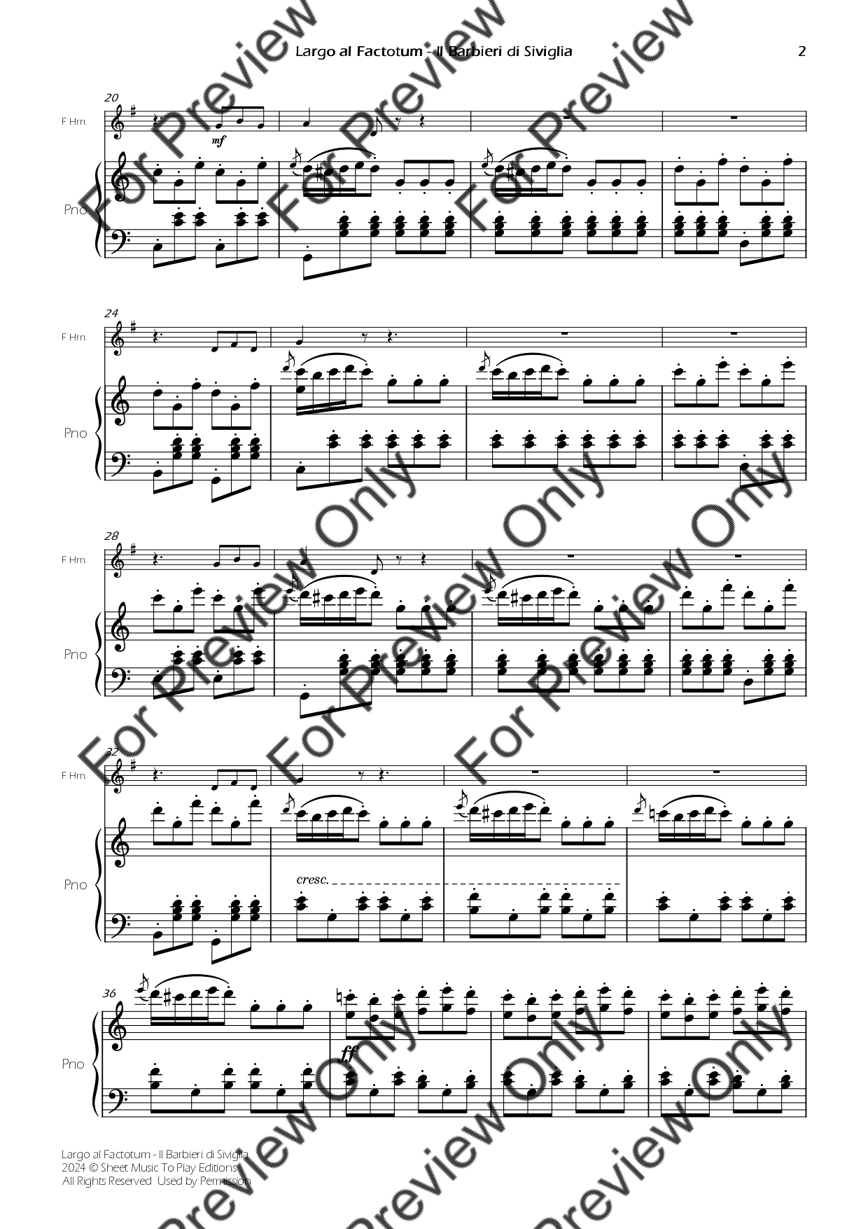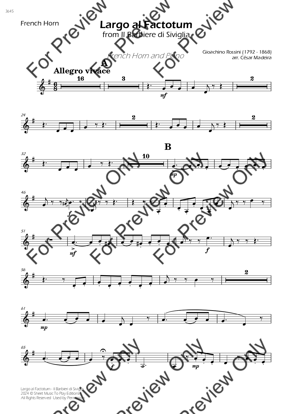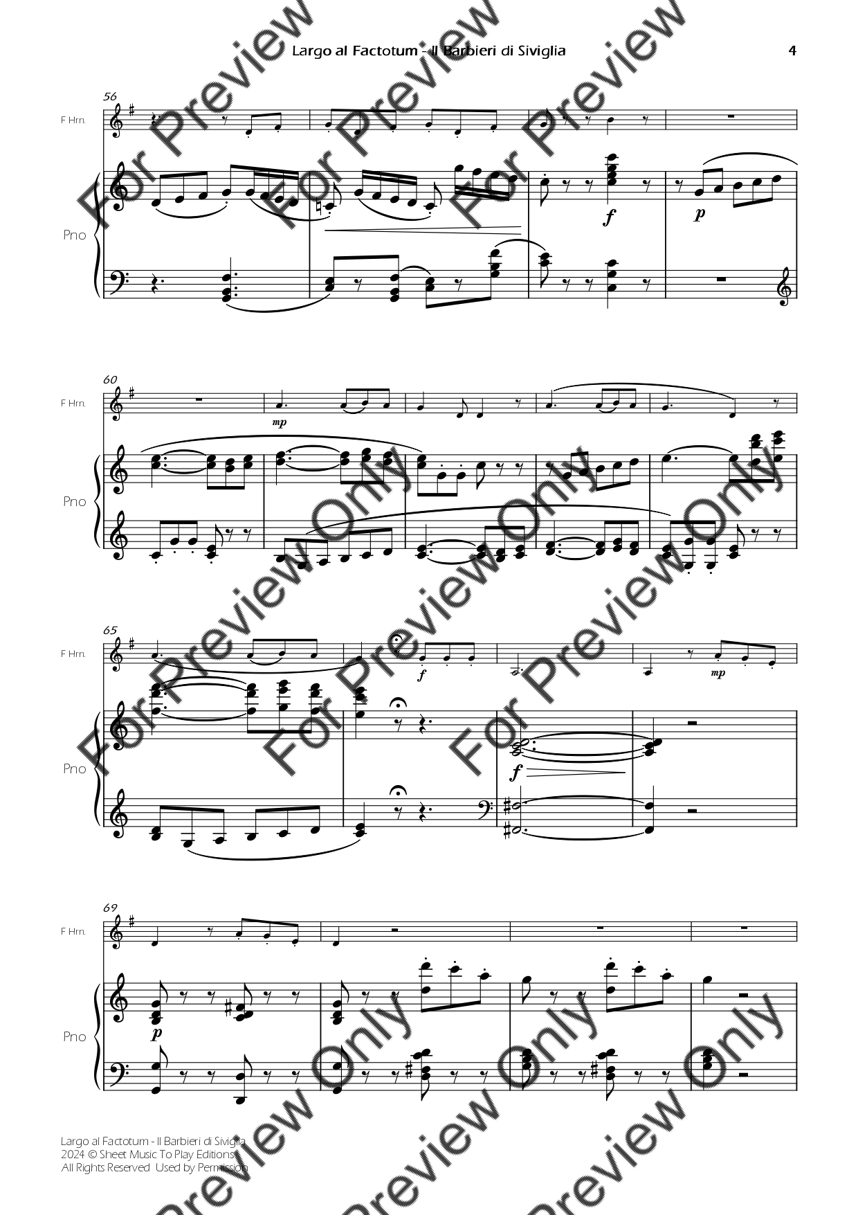Largo Al Factotum from Il Barbiere di Siviglia by Gioachino Rossini. Arrangement for French Horn and Piano. With Full Score and Individual Parts. Have fun!